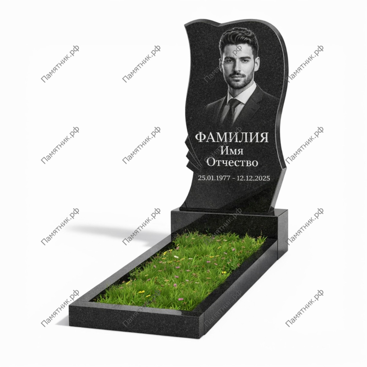 Несмотря на сложную форму, стела обладает достаточной площадью для нанесения крупного портрета и памятной надписи. Ансамбль дополнен массивной тумбой и цветником.