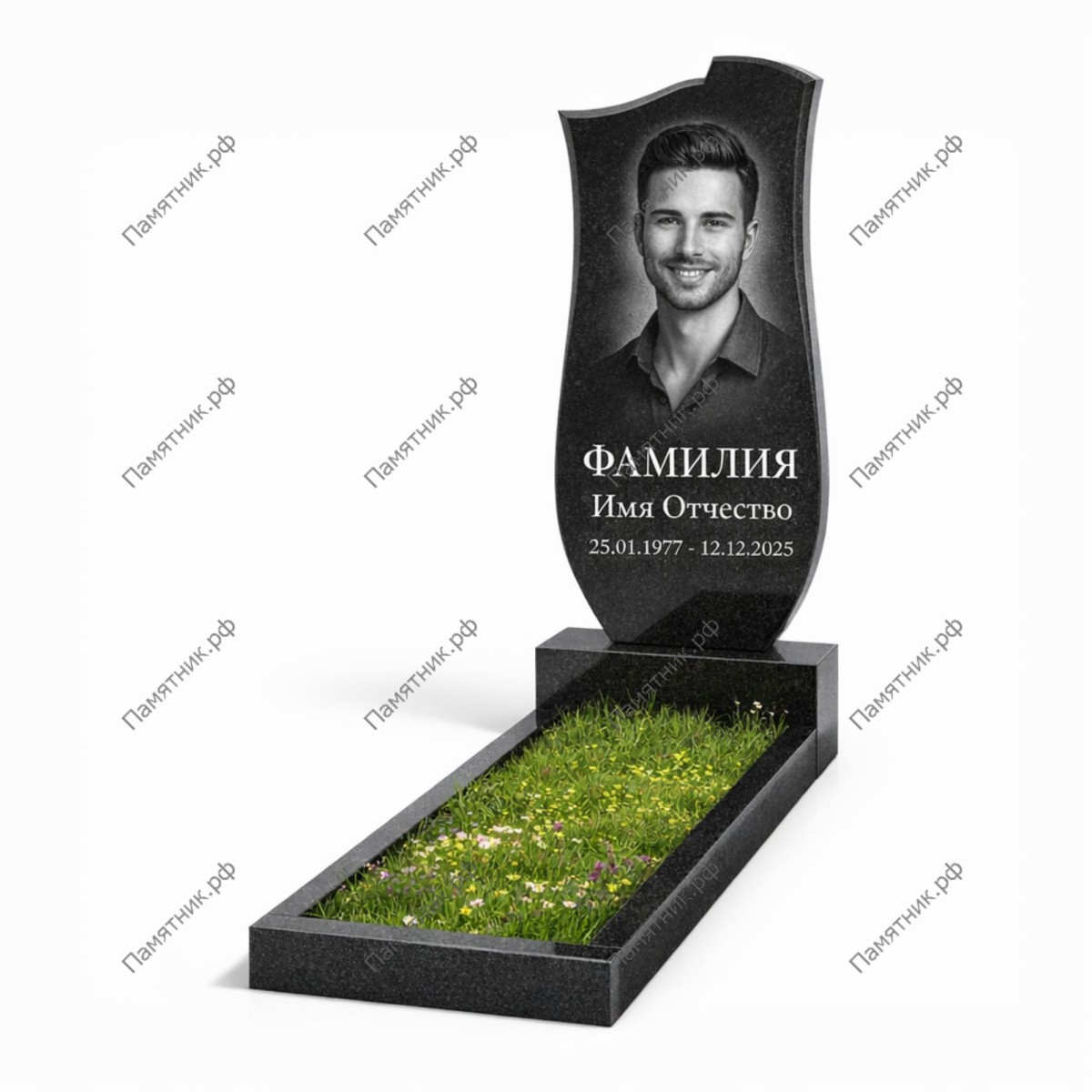 Изящные обводы стелы создают естественную рамку для портрета, делая его центральным элементом композиции. Модель комплектуется прочным основанием и аккуратным цветником.