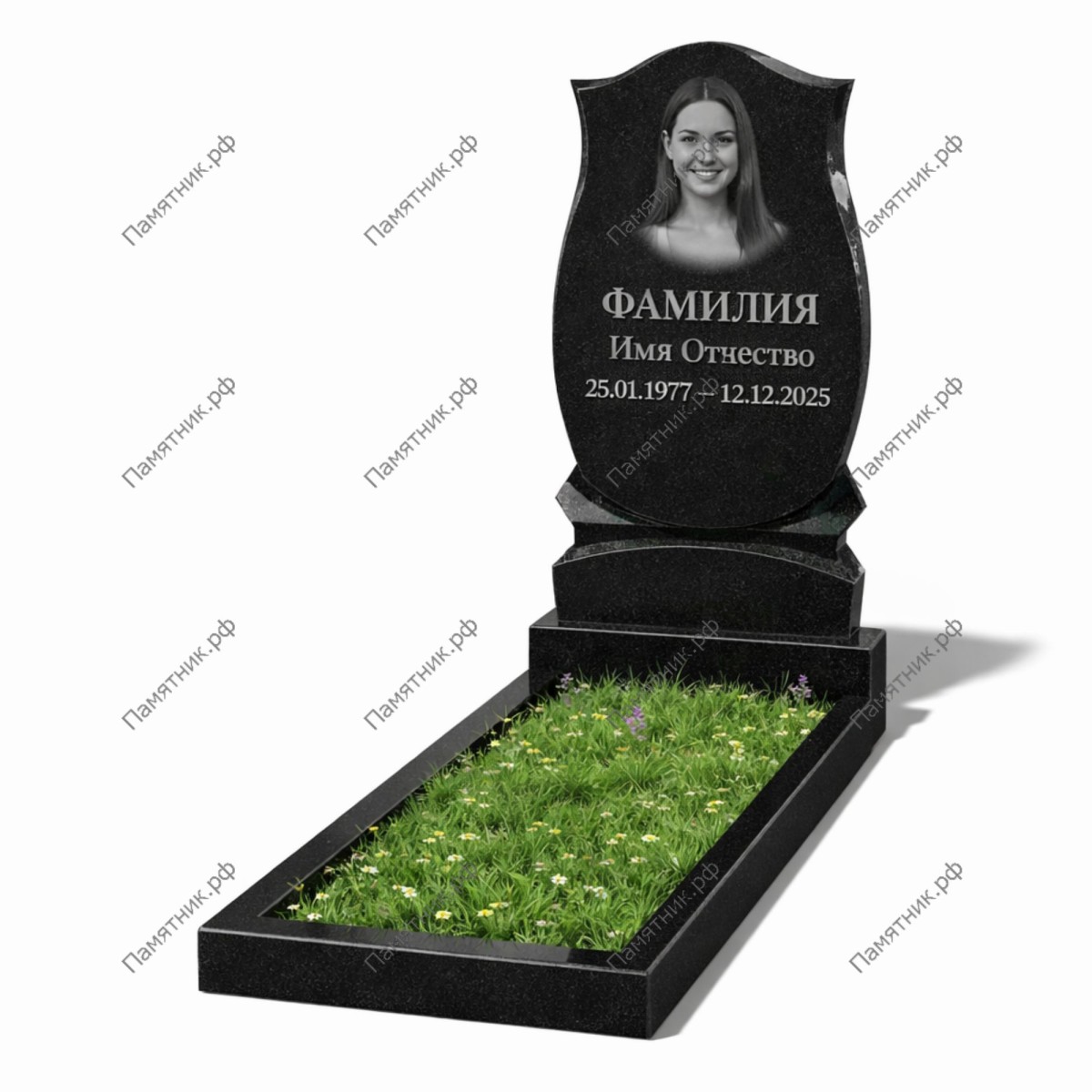 Широкая верхняя часть стелы оптимальна для размещения крупного портрета, который будет эффектно смотреться на фоне черного полированного камня. В комплект входит цветник для благоустройства территории.
