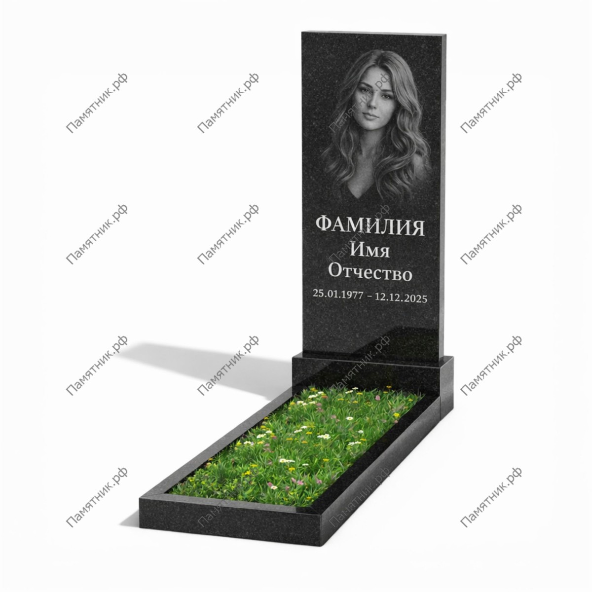 Максимально полезная площадь стелы открывает безграничные возможности для гравировки: от ростовых портретов до сложных пейзажных композиций на обратной стороне. В комплект входит тумба и цветник.