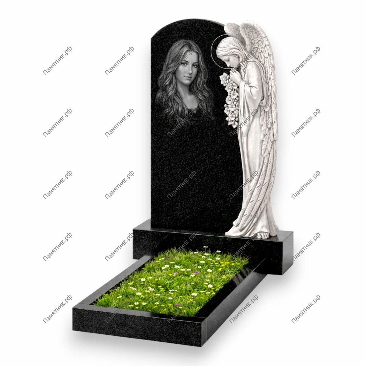 Классическая вертикальная стела с полукруглым завершением, дополненная полноростовой фигурой ангела с правой стороны. Ангел с нимбом над головой держит в руках ниспадающую гирлянду из цветов, смиренно склонив взгляд. Тонкая проработка складок одеяния и оперения крыльев демонстрирует высокое мастерство работы с камнем. Этот светлый образ символизирует чистоту души и вечное небесное покровительство.