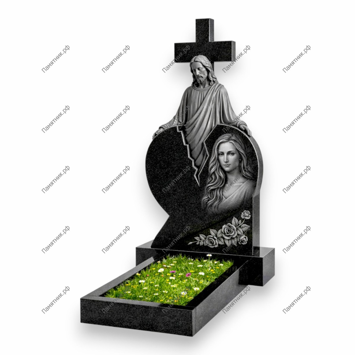 Эксклюзивный мемориальный комплекс, центральным элементом которого является стела в форме расколотого сердца. Над ним возвышается величественная резная фигура Иисуса Христа, оберегающего покой души. В нижней части композиции искусно вырезана ветвь роз. Памятник передает глубокий религиозный смысл, божественное покровительство и безграничную любовь, которая сильнее смерти.