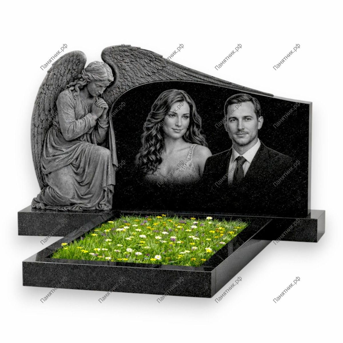 Горизонтальный мемориальный комплекс, идеально подходящий для семейного захоронения. Левую часть широкой стелы занимает монументальная фигура коленопреклоненного ангела. Его руки сложены в искренней молитве, а мощные, детально проработанные крылья словно укрывают гранитное полотно. Контраст светлой скульптурной резьбы и глубокого черного цвета полированного габбро-диабаза придает памятнику особую торжественность и благородство.