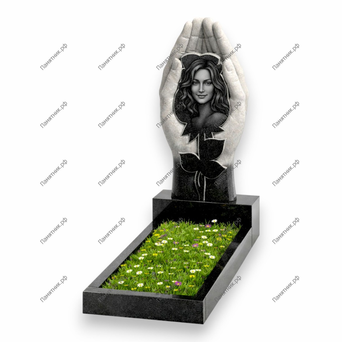 Уникальный и глубоко символичный памятник-скульптура. Барельеф выполнен в виде двух больших, заботливых рук, которые бережно держат изящный резной цветок, служащий обрамлением для портрета. Композиция воплощает собой абсолютную нежность, защиту высших сил и трепетное отношение к памяти ушедшего. Ювелирная работа с камнем позволяет передать мягкость линий и теплоту этого трогательного образа.