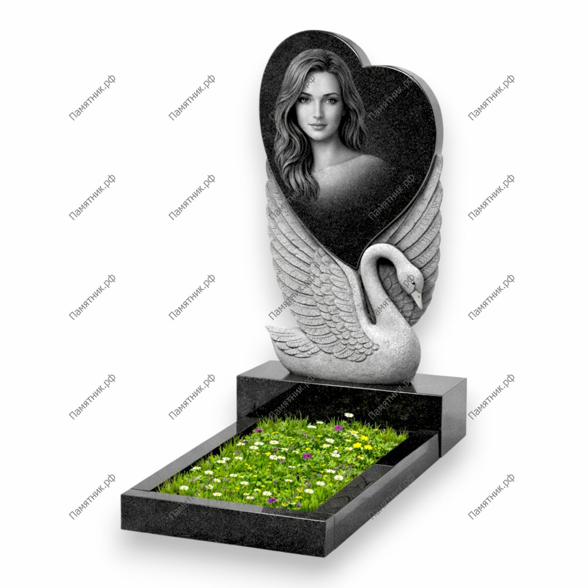 Потрясающая по красоте и исполнению композиция. В основании памятника высечена объемная фигура прекрасного лебедя. Его раскрытые крылья плавно поднимаются вверх, бережно обнимая центральную часть стелы, выполненную в форме идеального сердца. Лебедь традиционно олицетворяет верность, чистоту и бесконечную любовь, делая этот монумент непревзойденным символом светлой памяти.