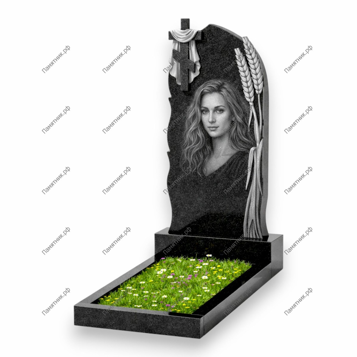 Благородный монумент с фигурной кромкой и глубоким философским смыслом. Левый верхний угол украшает резной крест, укрытый ниспадающей плащаницей, символизирующей скорбь и божественное покровительство. Вдоль правой грани высечены объемные колосья пшеницы — традиционный символ плодородия, завершенного жизненного пути и духовного возрождения. Идеальная зеркальная полировка карельского гранита подчеркивает каждую деталь барельефа.