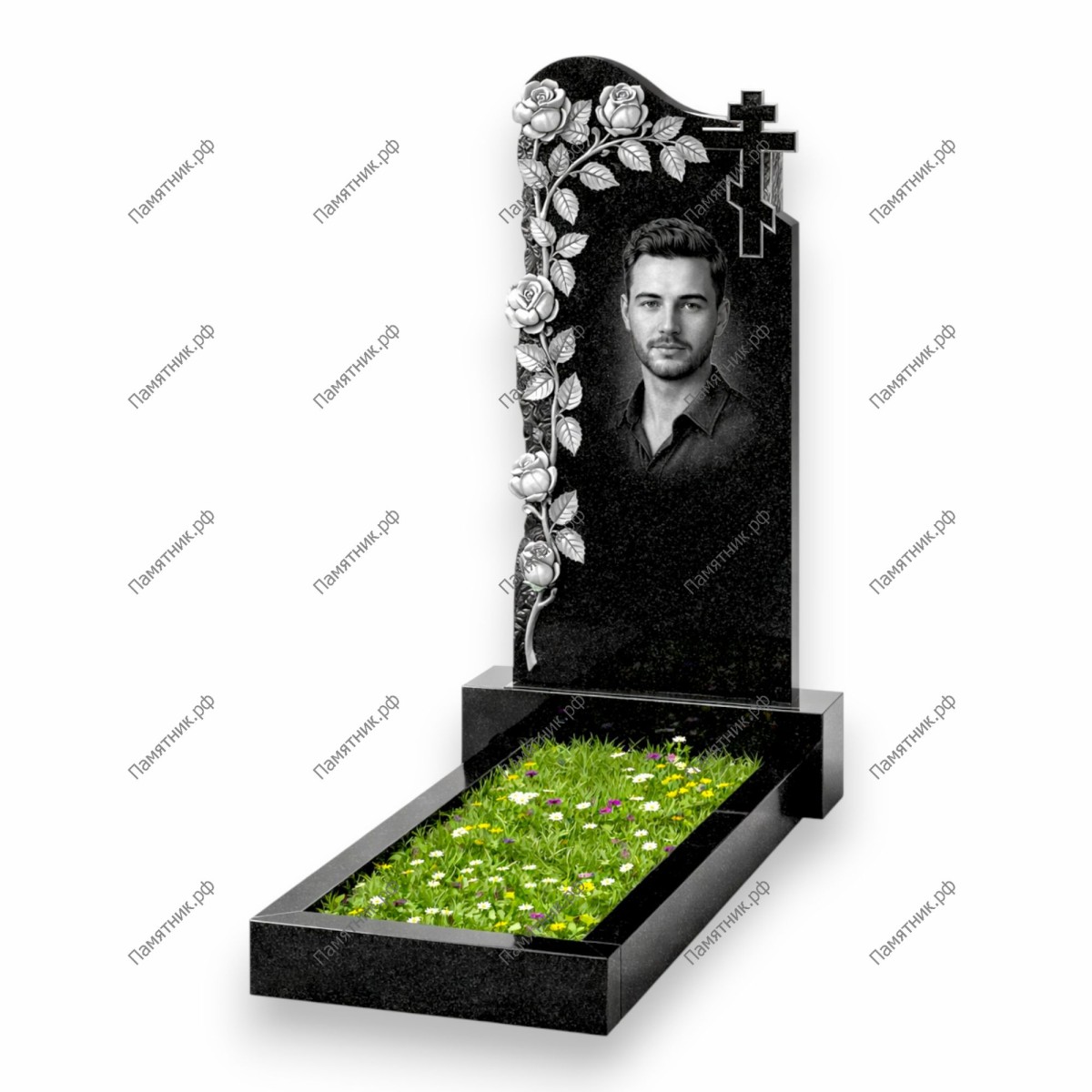 Торжественный монумент с фигурной асимметричной формой. Художественным центром композиции является пышная ветвь роз, изящно огибающая стелу по левому и верхнему краю. С правой стороны расположен строгий крест. Глубокая 3D-резьба делает цветы объемными и реалистичными, а безупречно гладкая поверхность черного габбро-диабаза создает идеальный фон для нанесения портрета и эпитафии.