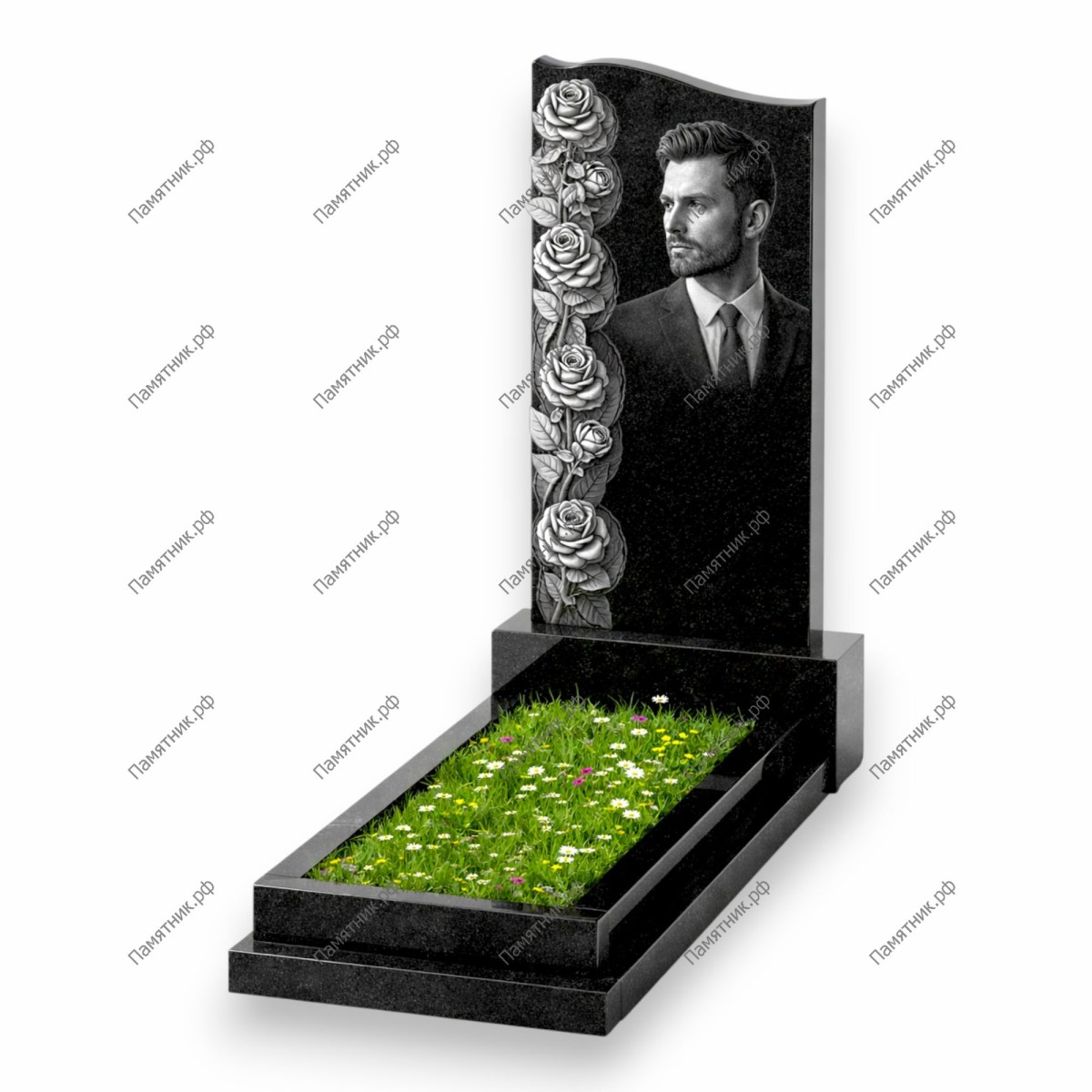 Статусная и лаконичная модель с плавным волнообразным завершением. Всю левую часть стелы занимает широкая, богато декорированная гирлянда из крупных резных роз. Цветы символизируют глубокие чувства, нежность и скоротечность земной красоты. Ровные линии и строгая геометрия правой части оставляют много пространства для художественного оформления и гравировки.
