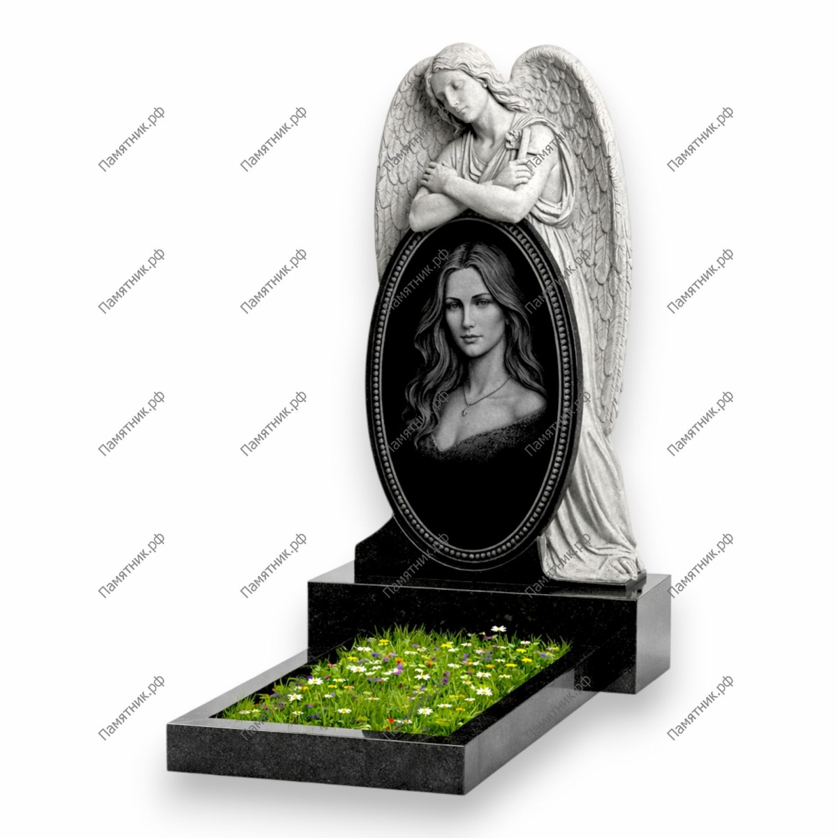 Утонченный памятник, где центральной частью выступает овальная стела-медальон. Позади нее высечен прекрасный ангел со сложенными руками и величественными крыльями, обрамляющими портрет усопшего. Эта композиция создает ощущение надежной защиты и небесного покровительства. Глубокий черный цвет карельского гранита подчеркивает чистоту и фактурность резного ангела.