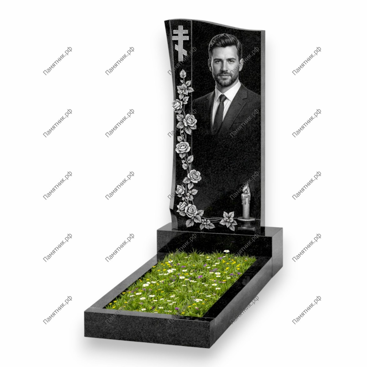 Классическая вертикальная стела с дугообразным верхом, дополненная богатым символизмом. Вдоль всего левого края вьется роскошная гирлянда из резных роз. В левом верхнем углу высечен православный восьмиконечный крест. В нижней правой части камня изображена зажженная свеча в подсвечнике — вечный символ неугасающей молитвы, света и бессмертия души.