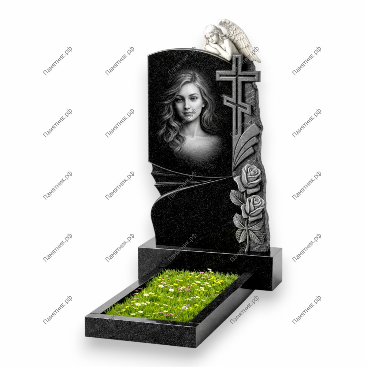 Сложная, высокохудожественная композиция, играющая на контрасте фактур. Правая грань памятника имеет обработку «скала» (природный скол), из которой выступают две объемные розы и строгий православный крест. На самом верху памятника отдыхает маленький резной ангел. Лицевая сторона украшена изящным волнообразным резом, разделяющим плоскость. Модель выглядит монументально и очень выразительно.