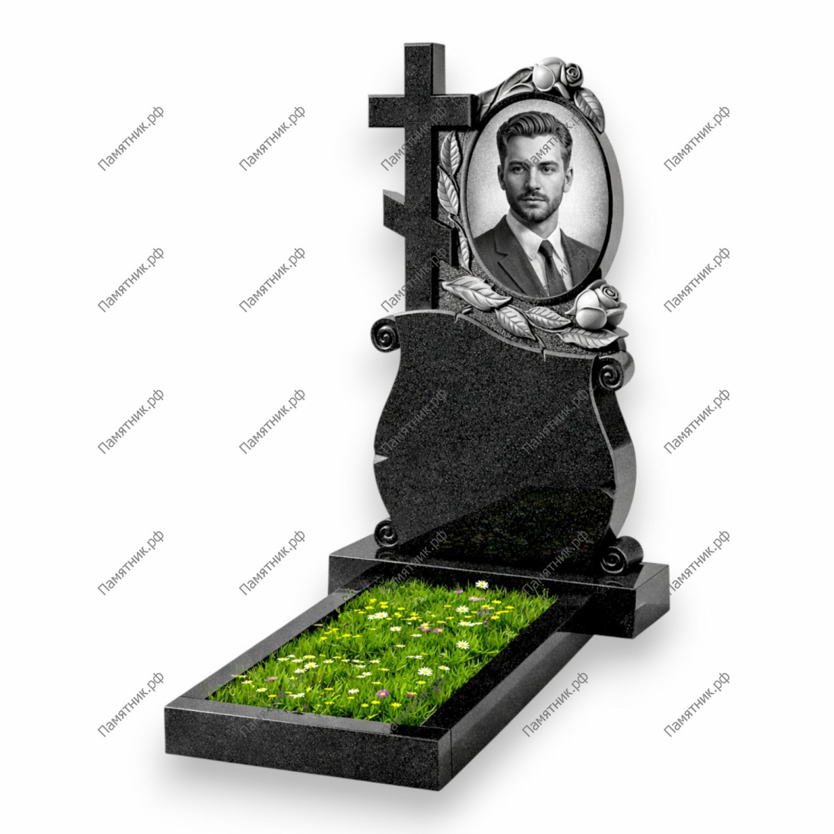 Оригинальная модель, сочетающая флористику и архитектурные элементы. Левую часть венчает массивный резной крест. Ниша для портрета имеет форму овала и снизу изящно подчеркнута ветвью с бутоном розы. Нижняя половина стелы виртуозно стилизована под развернутый старинный свиток — символ написанной Книги Жизни и мудрости. Памятник отличается сложной геометрией и благородным внешним видом.