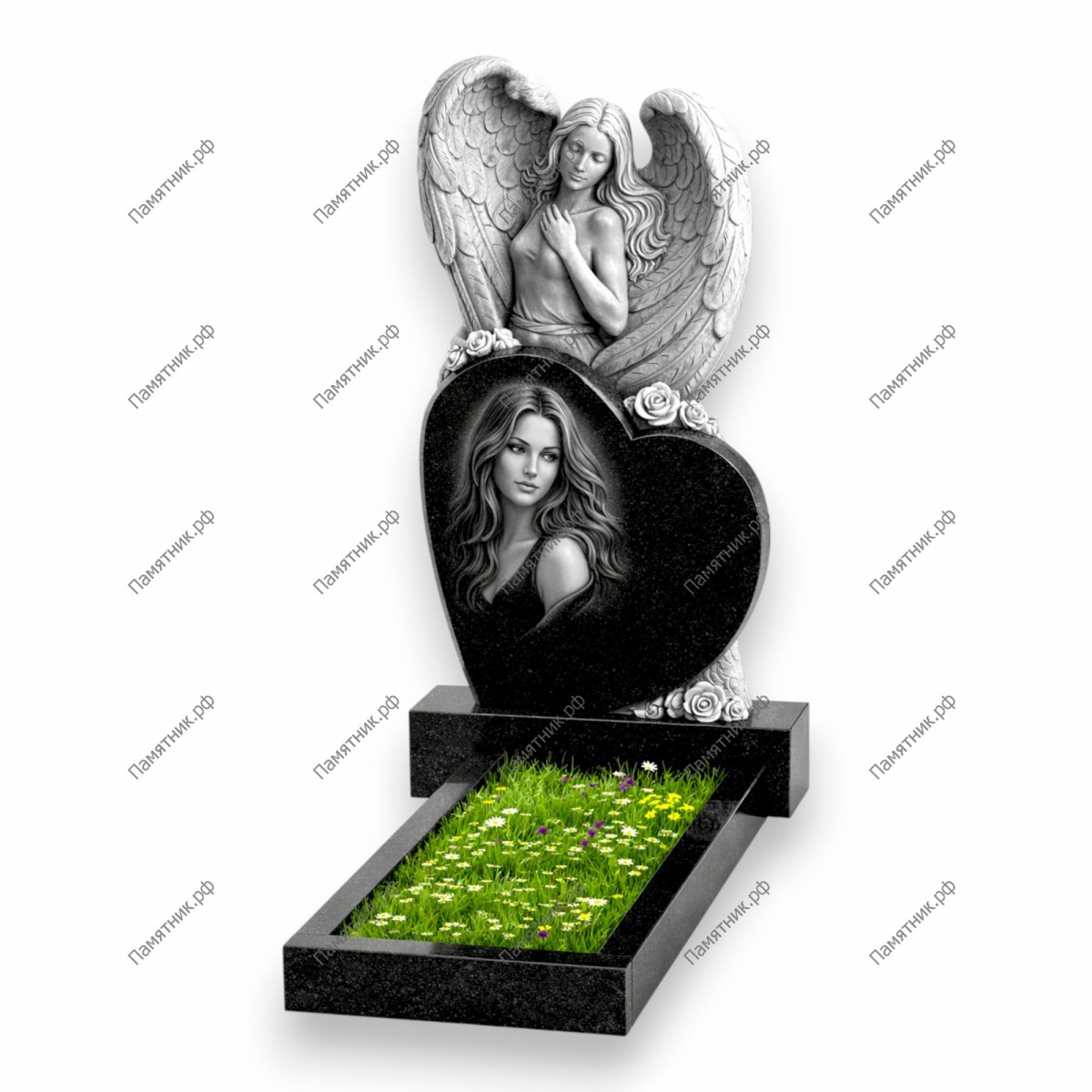 Потрясающая авторская работа, поражающая своей одухотворенностью. Основой композиции служит массивная стела в виде сердца, над которым возвышается прекрасный ангел с распахнутыми крыльями. Ангел трепетно прижимает руку к груди, оберегая покой усопшего и выражая безмерную скорбь. Переход между скульптурой и полированным камнем украшен резными розами. Памятник олицетворяет неразрывную связь, вечную любовь и надежное небесное покровительство.