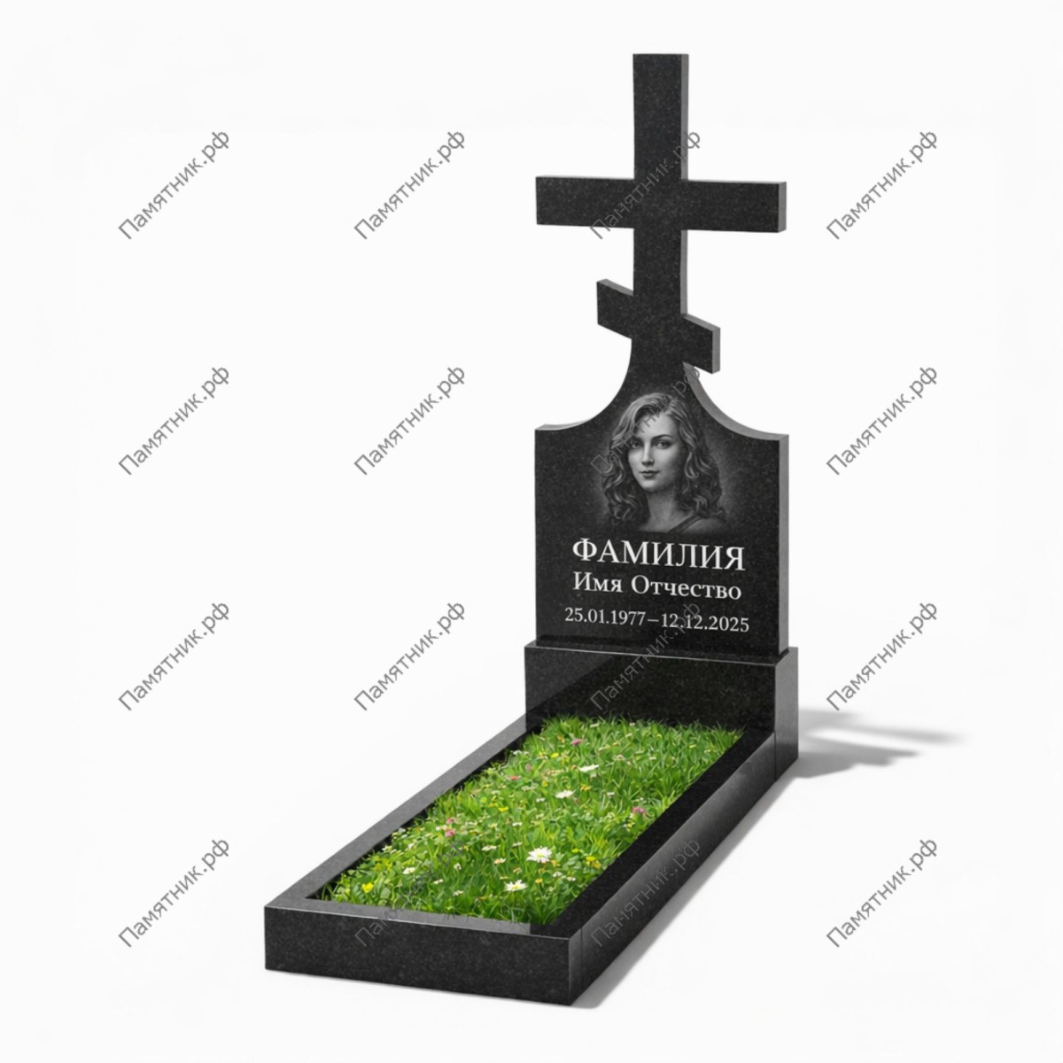 Лаконичный крест со скругленными углами перекладин. Такая форма лишает памятник излишней остроты, создавая образ покоя и умиротворения. Цветник классического размера позволяет гармонично дополнить комплекс живыми растениями.