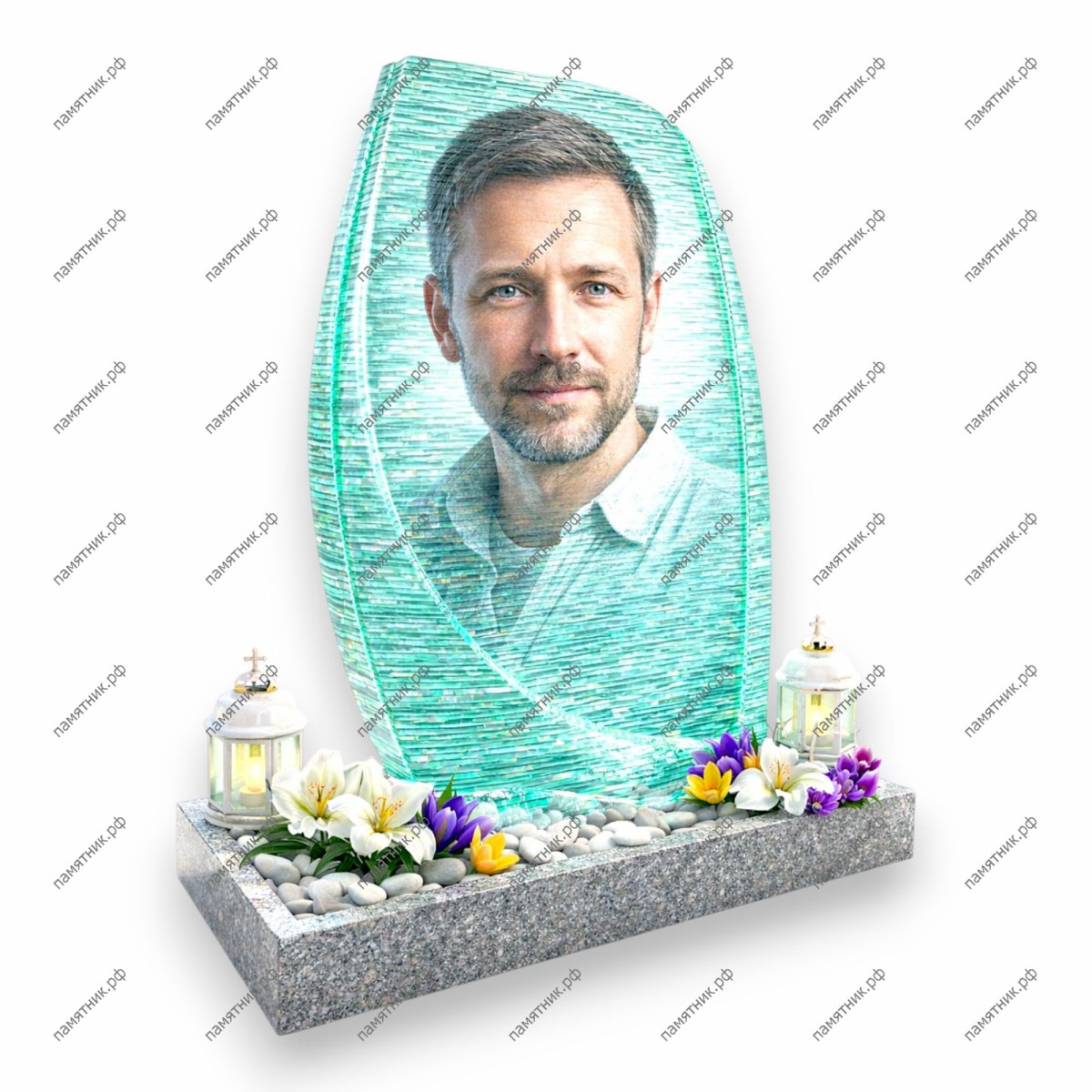 Памятник со стеклом ПС-1 — это воздушная и светлая композиция, центральным элементом которой является овальная стела из бирюзового художественного стекла. Стекло имеет уникальную горизонтальную текстуру, напоминающую рябь на воде, что придает портрету особую глубину. Основание из светлого гранита оформлено в виде открытого цветника, заполненного белой галькой и декоративными цветами.