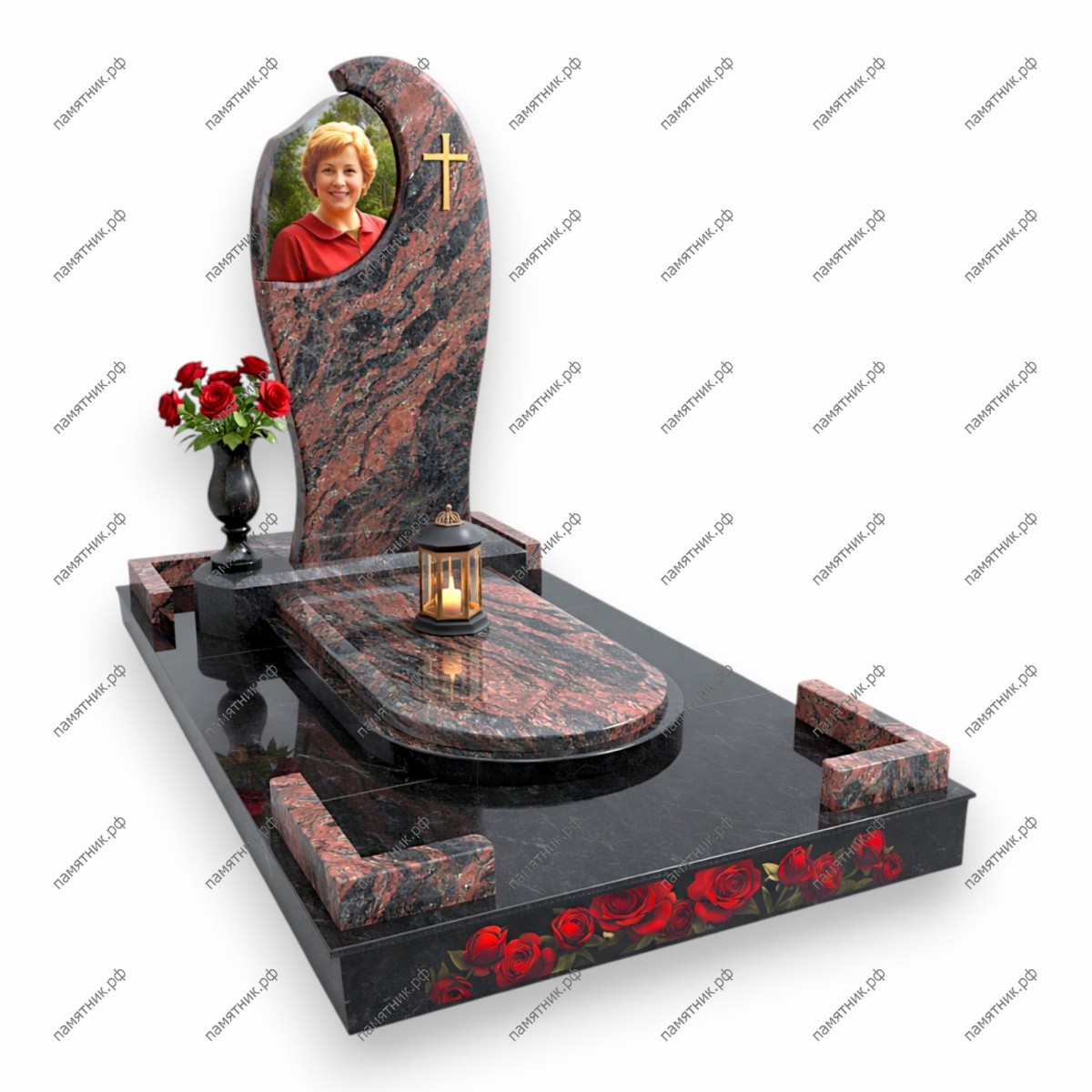 Статусный мемориал из гранита с активной текстурой. Изогнутая стела дополнена основанием, где на черный гранит нанесены изображения красных роз, создавая яркий акцент.