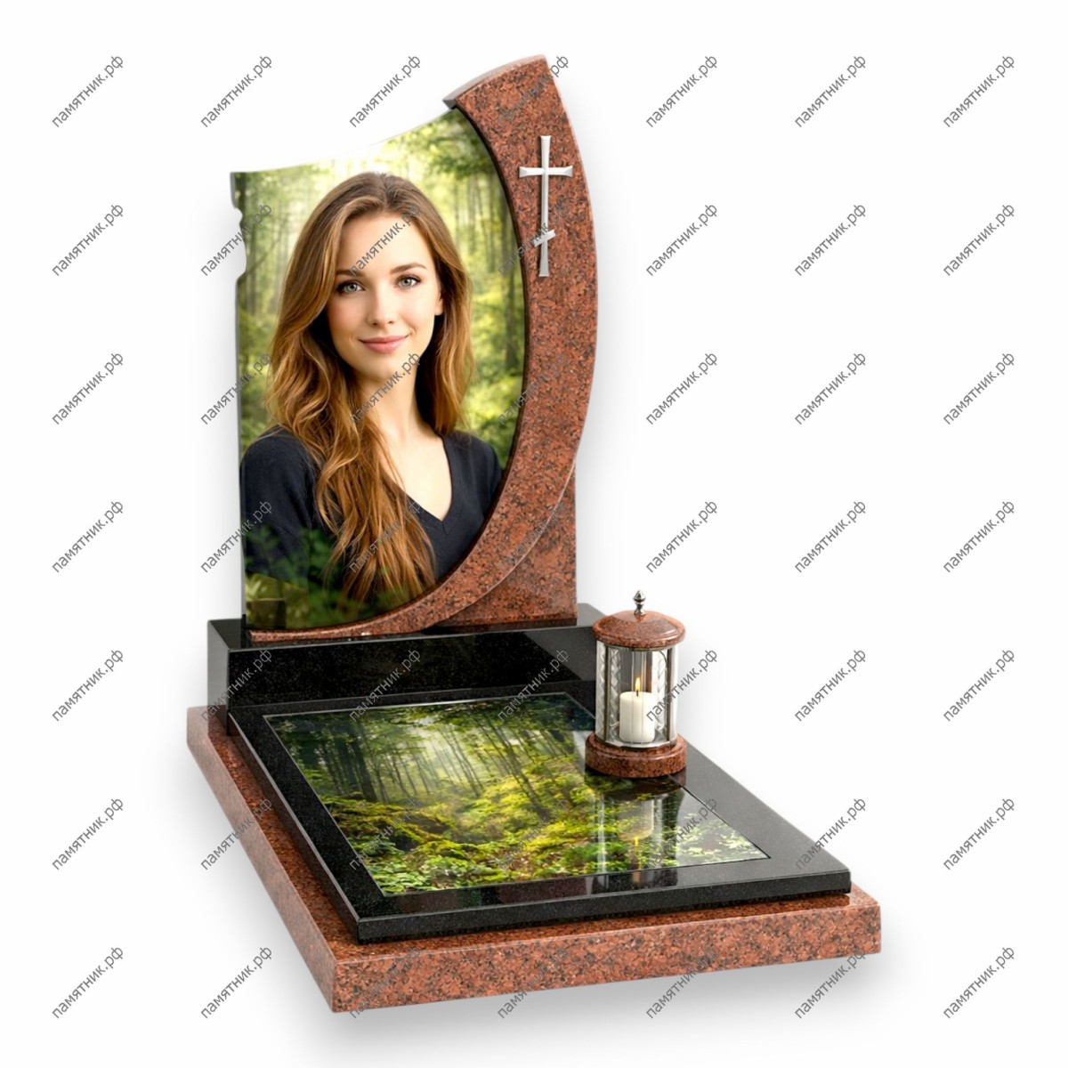 ПС-118 представляет собой лаконичную и статусную модель. На фоне массивной красной стелы с портретом выделяется серебристый крест. Горизонтальная плита полностью занята стеклянным панно с детализированным изображением лесного ручья, создающим атмосферу тишины и умиротворения.