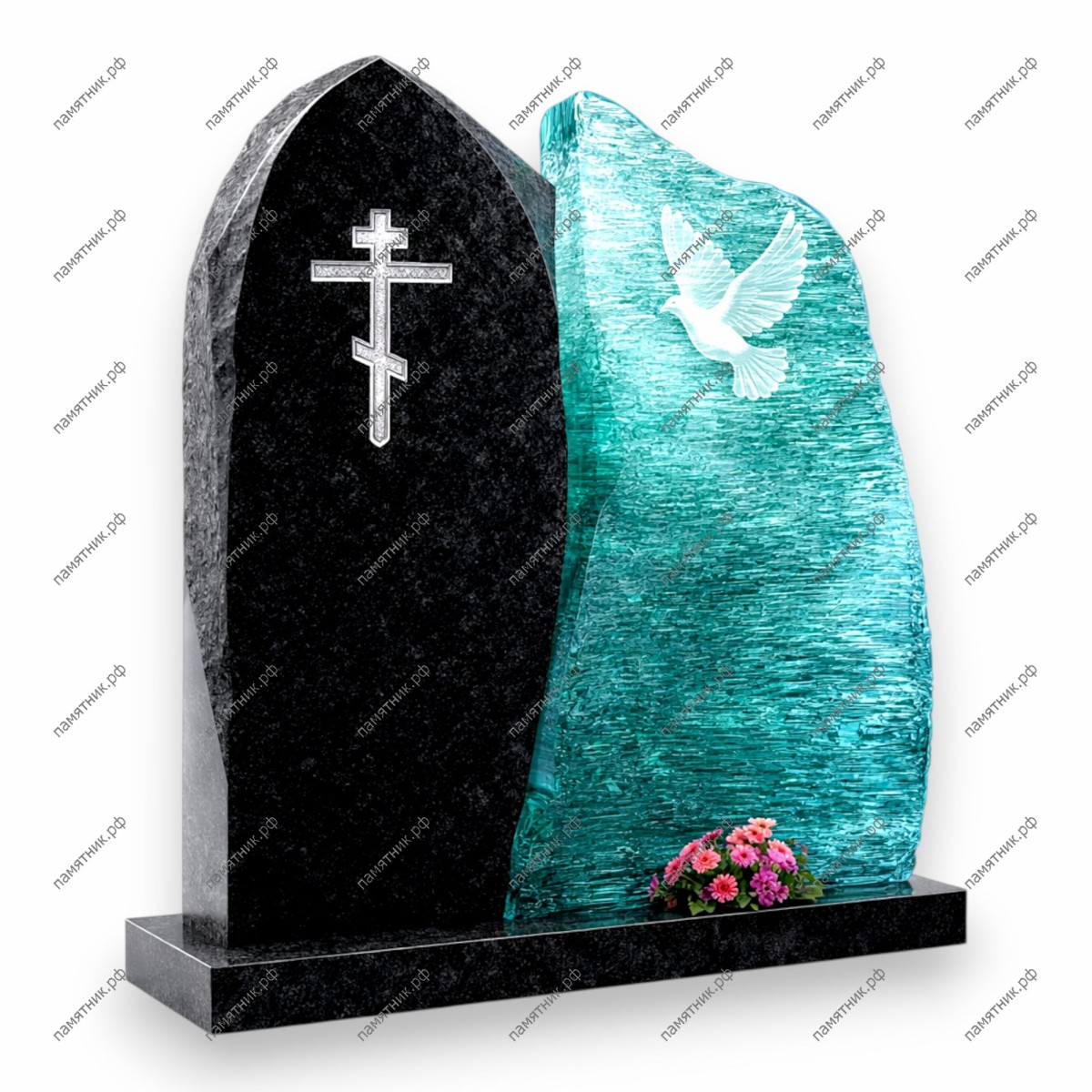 Памятник со стеклом ПС-12 представляет собой монументальную парную композицию, символизирующую единство земного и небесного. Левая часть выполнена из строгого черного гранита с гравировкой православного креста, а правая — из бирюзового художественного стекла с изображением летящего белого голубя. Асимметричные «скалистые» края стеклянного элемента придают памятнику динамику и современный вид.