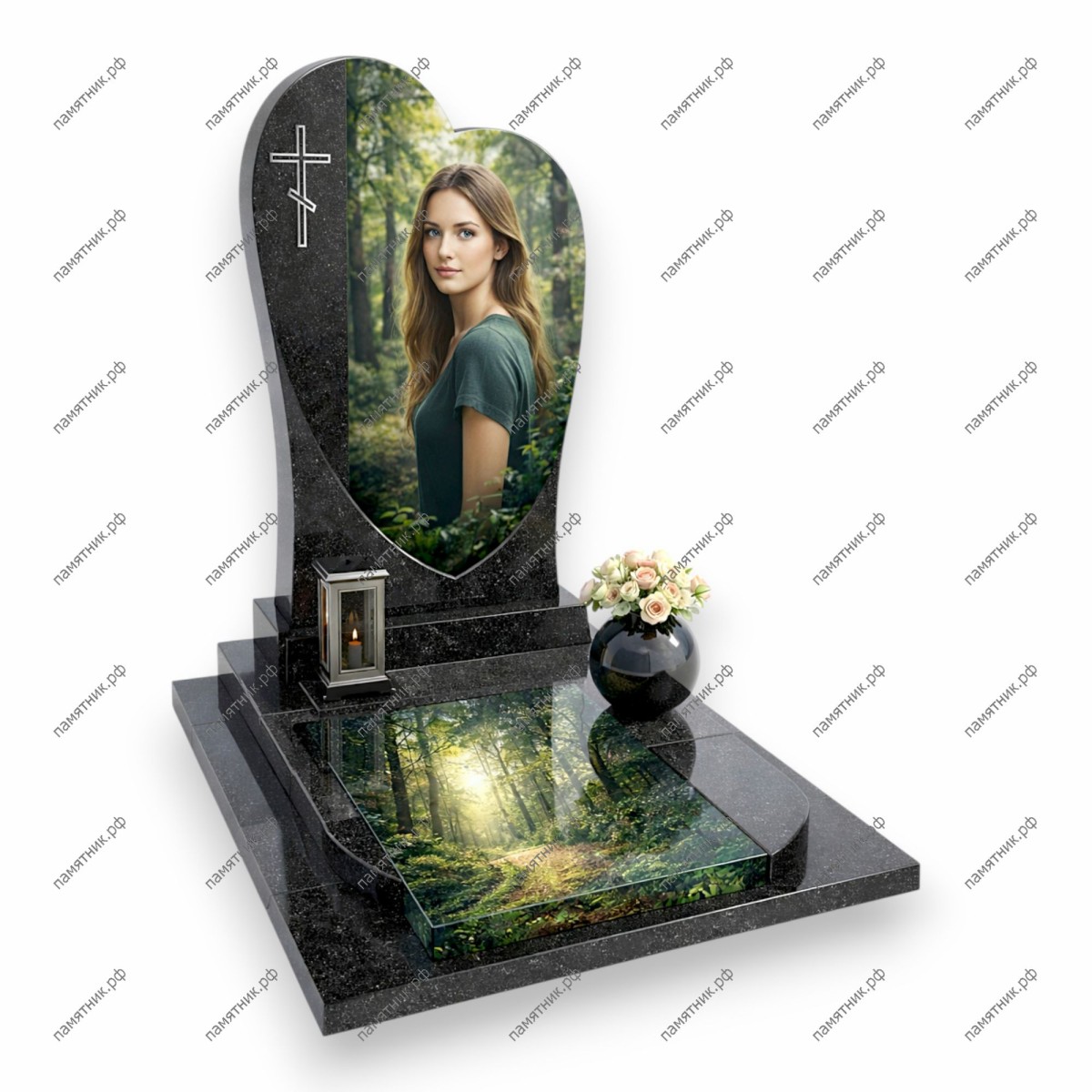 Модель ПС-120 в форме сердца — классический символ любви и вечной памяти. Черная гранитная стела дополнена стеклянным панно в основании, на котором запечатлена тропа в солнечном лесу. Модель выглядит строго и одновременно очень душевно за счет интеграции пейзажа.