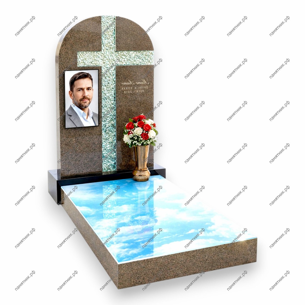 Строгий и торжественный мемориал ПС-124 с доминирующим христианским символом. Центральный элемент стелы — высокий крест, инкрустированный кристаллами стекла, который перекликается с небесной гладью, изображенной на всей поверхности надгробной плиты.