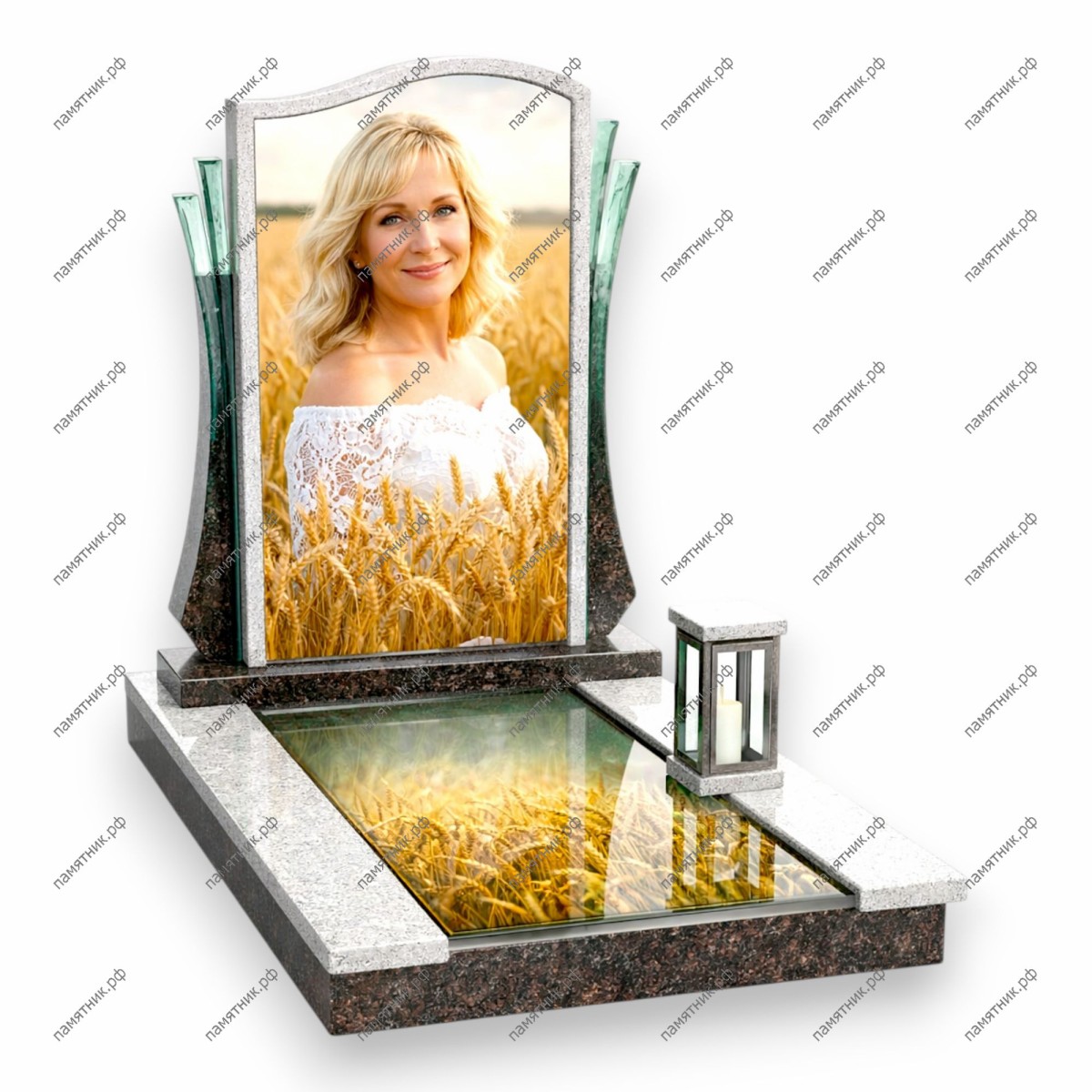 Модель ПС-125 выделяется архитектурной сложностью и обилием стеклянных элементов. Основная стела обрамлена вертикальными стеклянными колоннами, а портрет на фоне пшеницы дополнен горизонтальным 3D-панно в основании, создающим эффект присутствия в летнем поле.