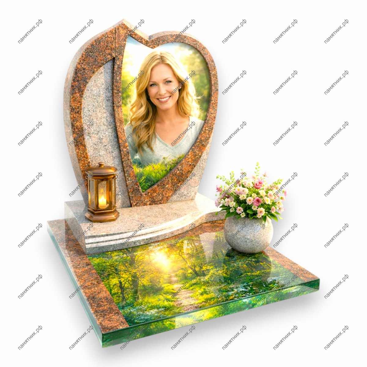 ПС-129 — классический символ любви в современном исполнении. Стела в форме сердца из светлого гранита обрамляет портрет на фоне летней зелени. Горизонтальное стекло в основании продолжает лесной мотив, создавая законченный природный ансамбль.
