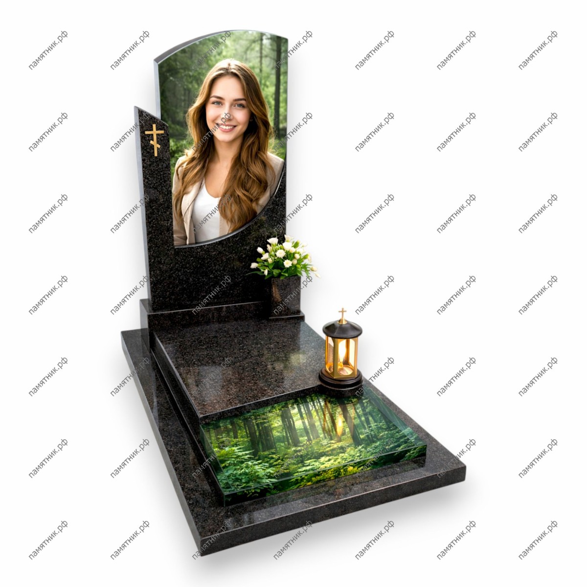 Элегантный и строгий мемориал ПС-130. Черная стела с волнообразным вырезом служит рамой для портрета в солнечном лесу. Горизонтальная плита полностью занята стеклянной вставкой с густым хвойным лесом, создающим эффект бесконечного покоя.