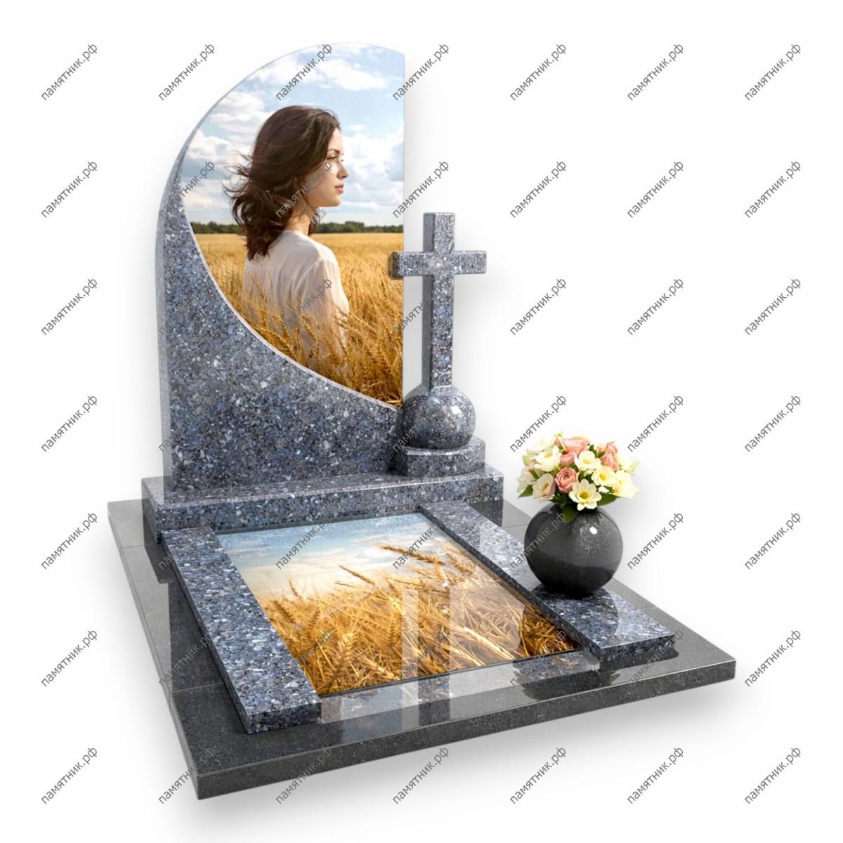 Изящный мемориал ПС-133 пропитан светом летнего утра. Стела из синего лабрадорита плавно переходит в каменный крест, а на стеклянных элементах запечатлено золотое пшеничное поле, уходящее за горизонт, что придает памятнику особую душевность.
