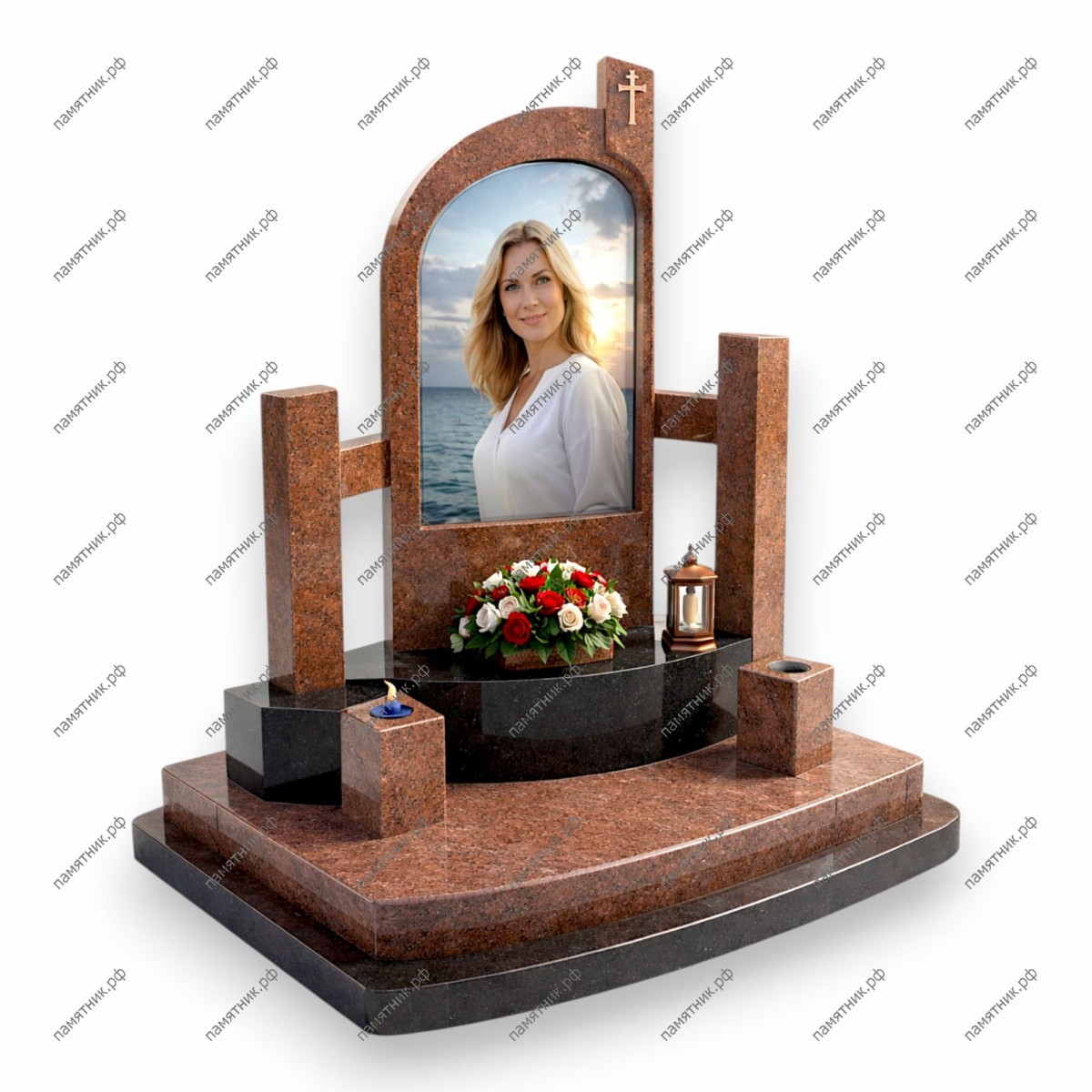 ПС-138 — это динамичная архитектурная модель из красного гранита. Асимметричная арка дополнена вертикальными колоннами-пилонами, что придает мемориалу современный и статный вид. Портрет на фоне моря наполняет композицию светом и воздухом.
