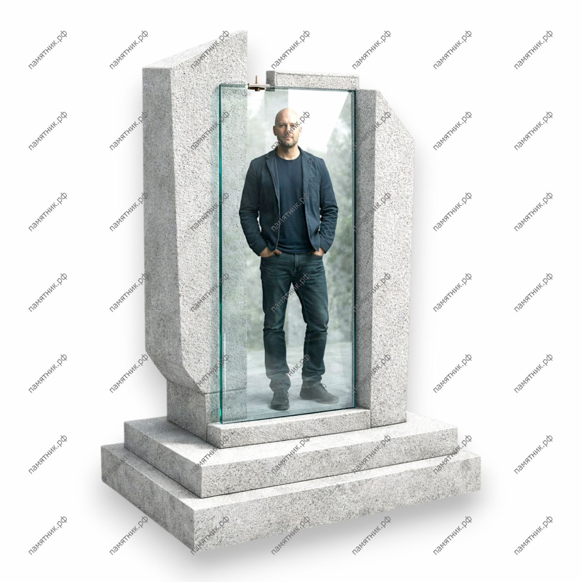 ПС-143 — это минималистичный и статусный мемориал в светлых тонах. Массивные гранитные блоки с грубо обработанными краями обрамляют прозрачную стеклянную панель с ростовым портретом, создавая эффект легкости и открытости пространства.