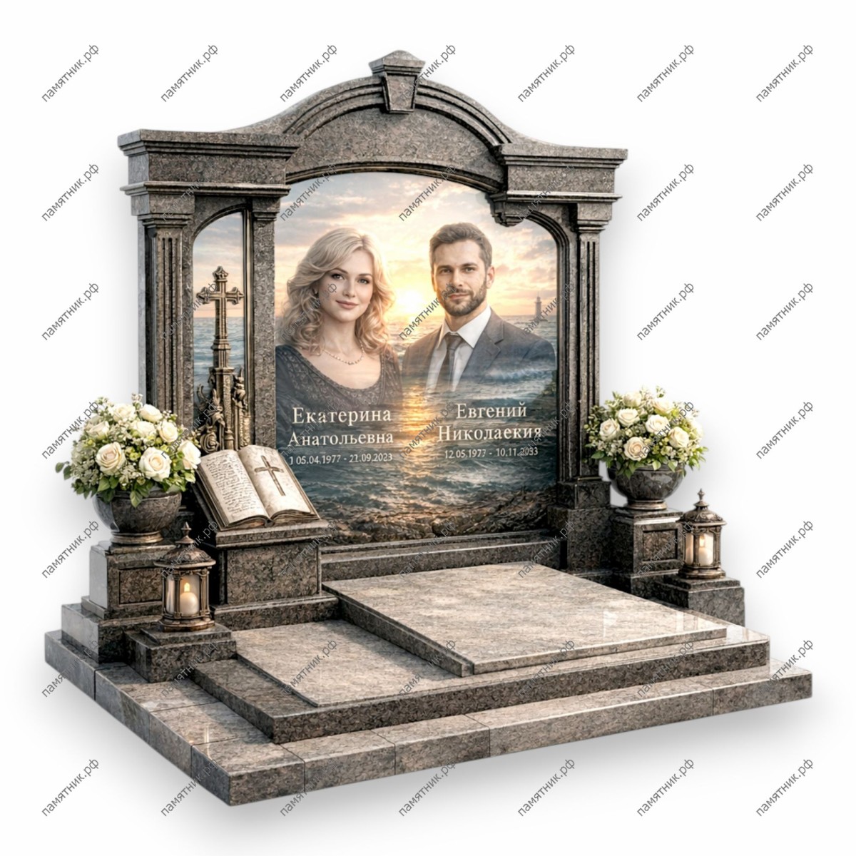 Величественный семейный мемориал ПС-144, выполненный в стиле классического портала с колоннами. Широкоформатное фотостекло с изображением пары на фоне морского заката дополнено скульптурными элементами, подчеркивающими историю жизни.