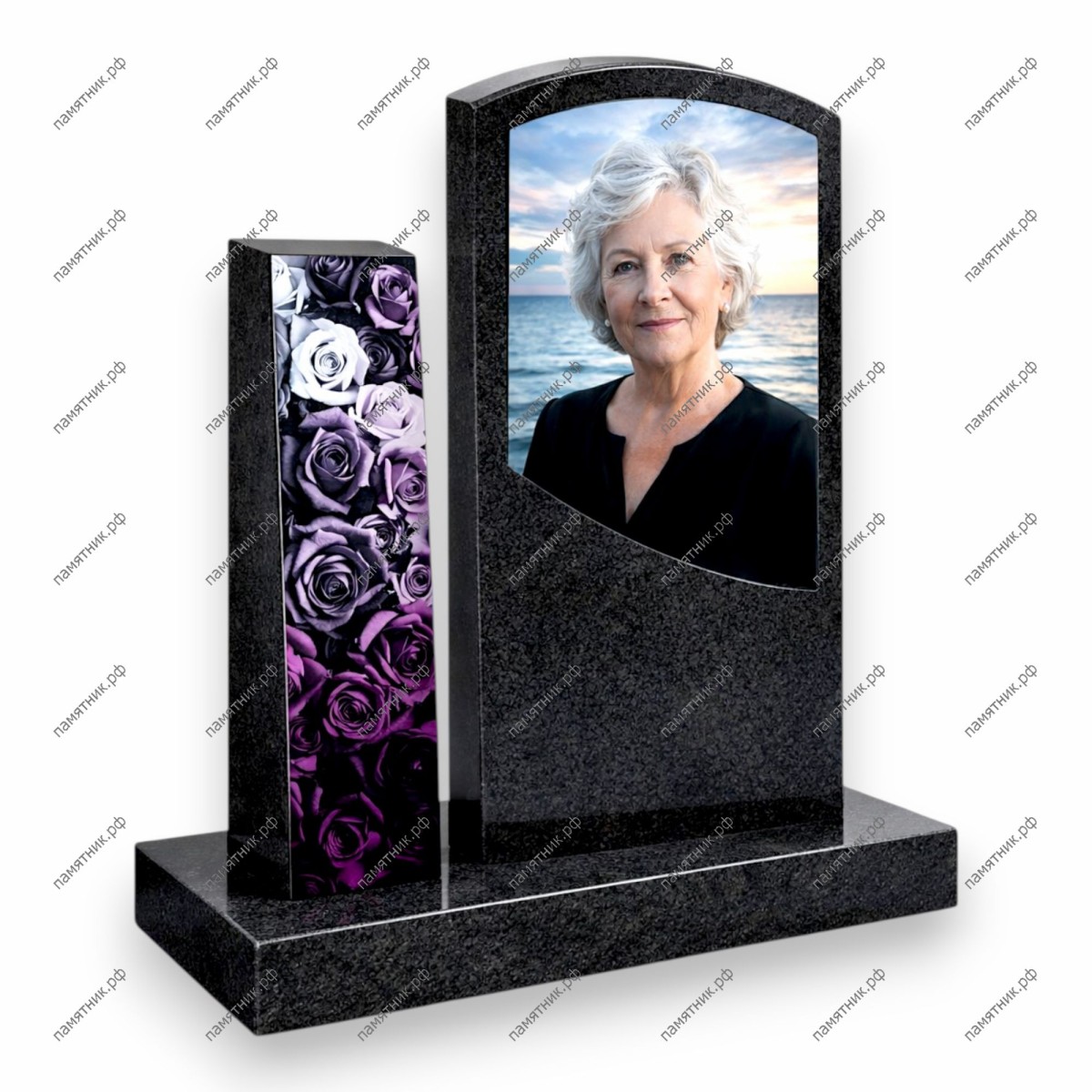 Стильная модель, состоящая из двух вертикальных блоков. Основная стела содержит портрет на фоне моря, а узкий декоративный блок украшен насыщенным флористическим принтом с розами, добавляя мемориалу индивидуальности.