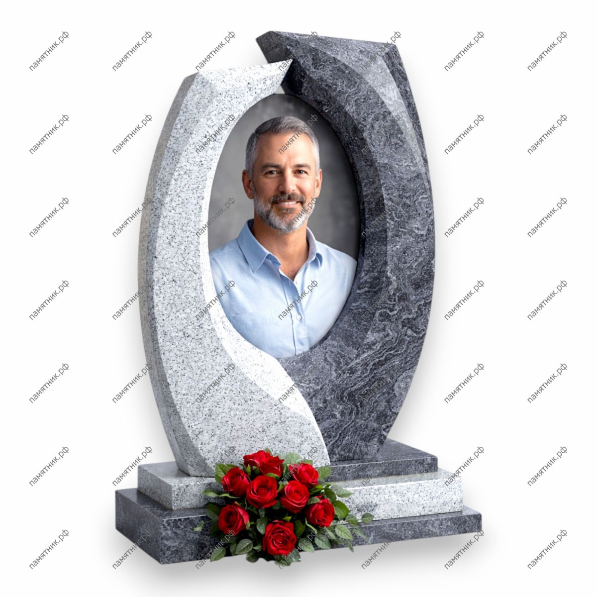 Художественная модель, символизирующая бесконечность и единство. Две переплетающиеся дуги из светлого и темного гранита образуют эллипс, внутри которого заключен овальный стеклянный портрет.