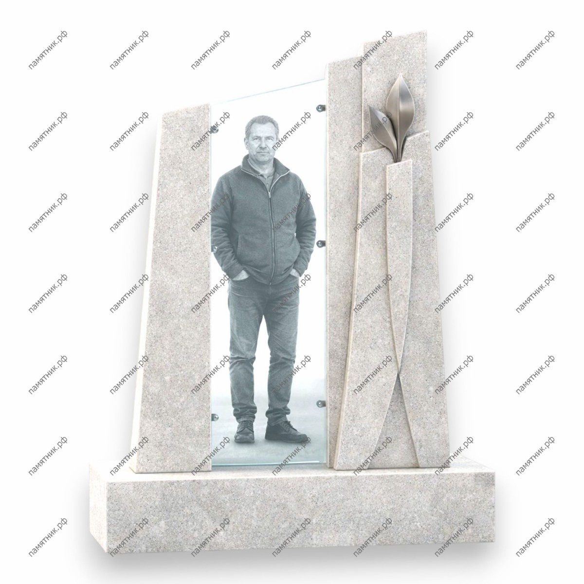 Лаконичный современный монумент из светлого мелкозернистого гранита. Ростовой портрет на стекле закреплен между двумя гранитными пилонами, один из которых украшен изящным металлическим декором в виде распускающегося цветка.
