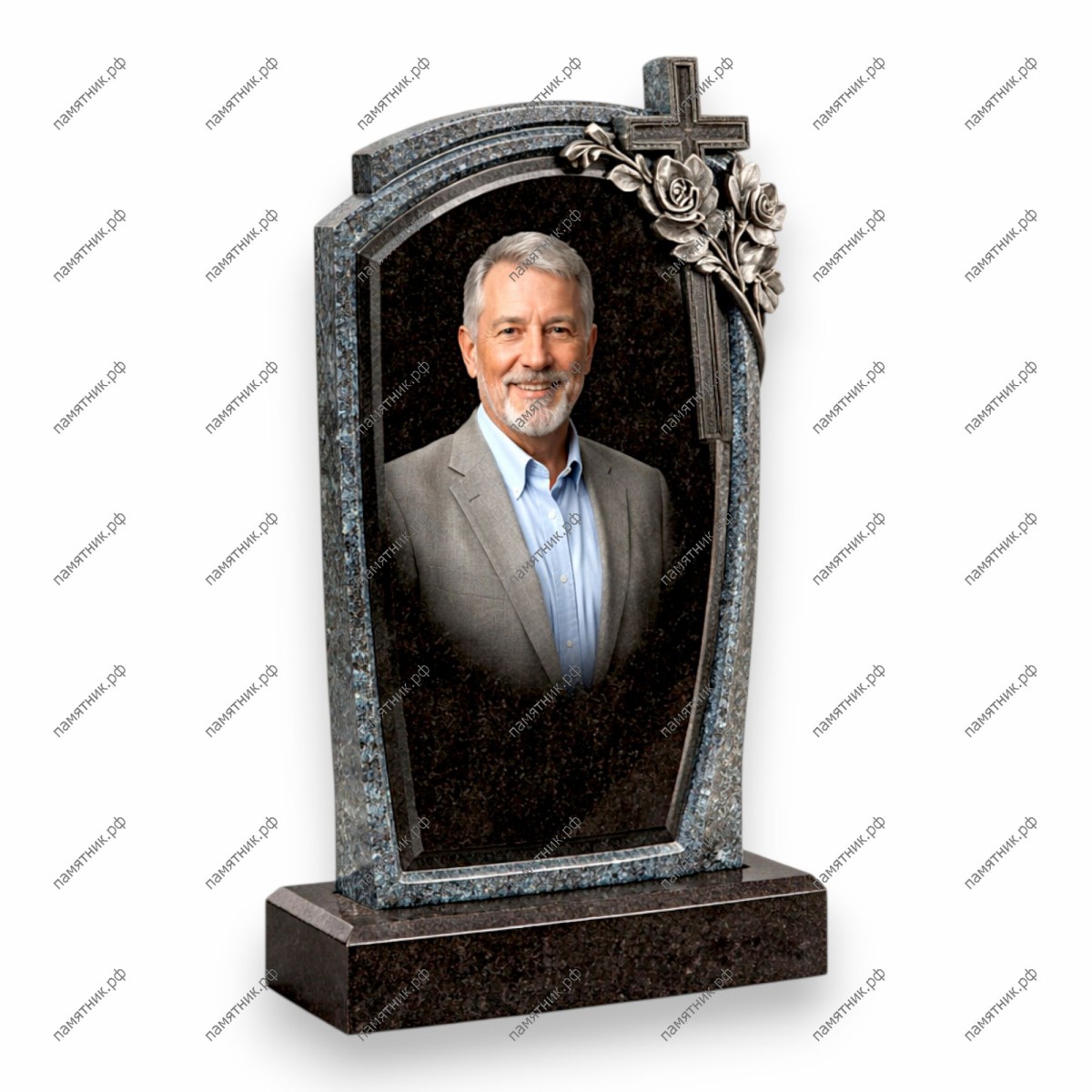 Классическая модель из благородного сине-серого лабрадорита с эффектом иризации. Срезанный угол стелы акцентирован объемным серебристым декором — православным крестом в окружении пышных роз.