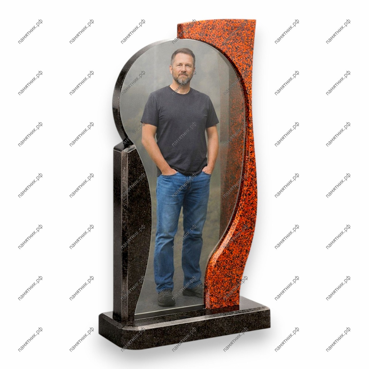 Современный мемориал, сочетающий огненную текстуру оранжевого гранита и строгость черного камня. Плавная S-образная линия разделяет материалы, мягко огибая ростовой стеклянный портрет.