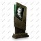 Геометрическая модель в стиле хай-тек из темно-зеленого мелкозернистого гранита. Резкие, ломаные линии стелы и наклонная стеклянная вставка с черно-белым портретом создают образ решительности и твердости.