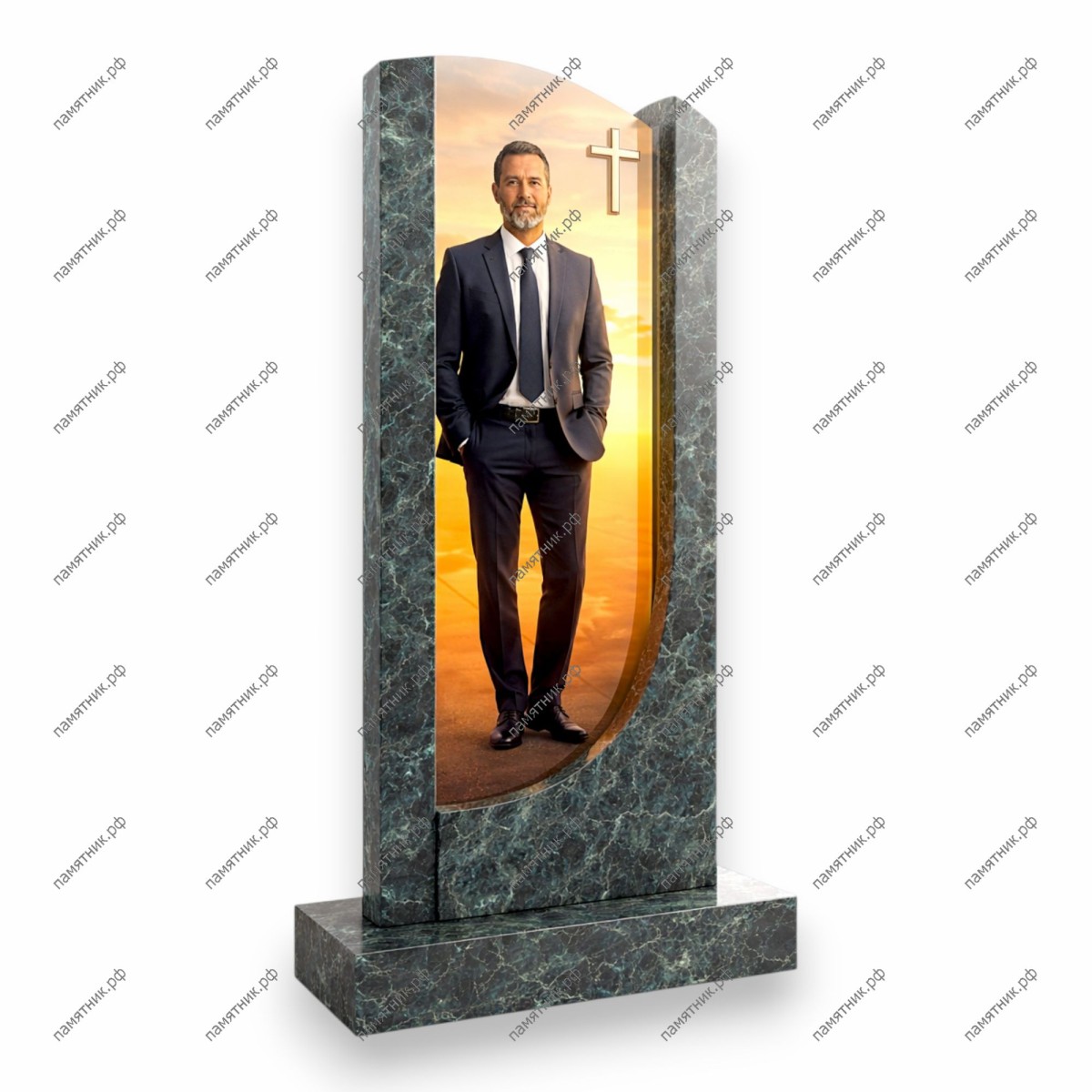 Величественный монумент из благородного зеленого мрамора с характерным природным рисунком. Конструкция в виде высокого портала с изящным арочным вырезом в нижней части создает эффект окна в вечность. Золотистый православный крест в верхней части акцентирует духовную значимость мемориала.