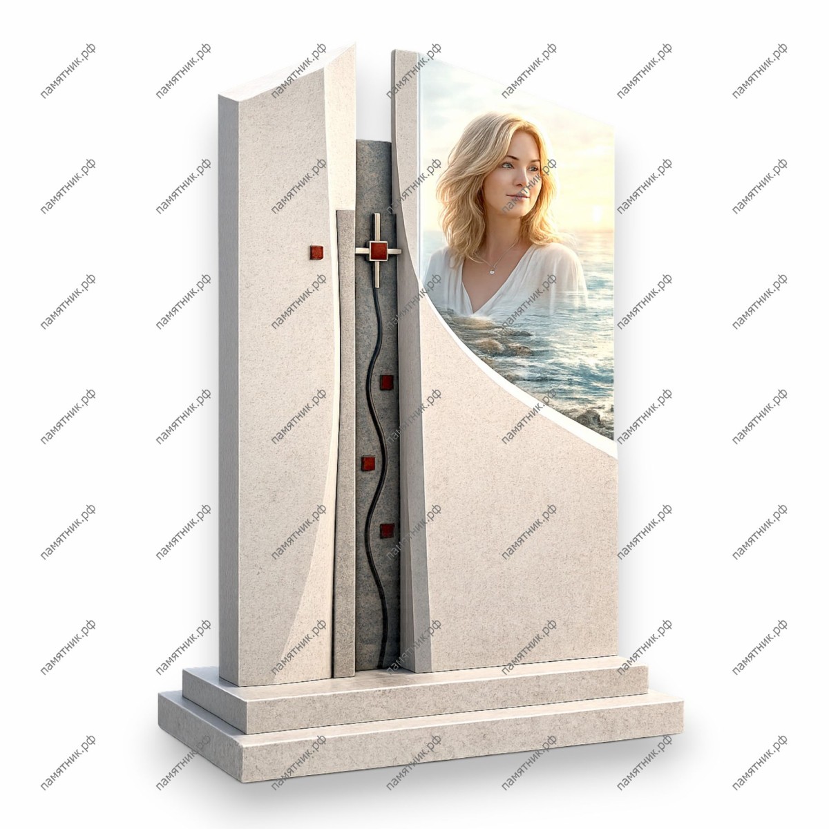 Сложная архитектурная композиция из светлого гранита, состоящая из двух вертикальных стел. Центральным элементом является декоративная вставка из темного камня с извилистой металлической линией и красными акцентами, символизирующими жизненный путь.