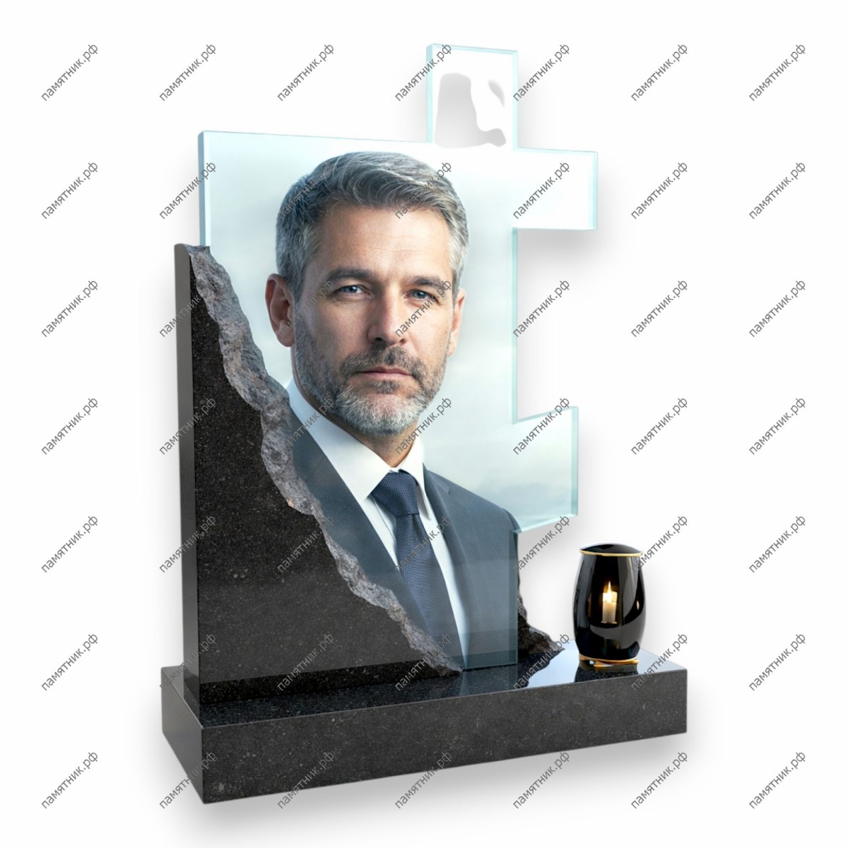 Контрастная модель, объединяющая необработанную природную силу и современные технологии. Левая часть стелы выполнена в виде «скалы» с рваным краем, которая словно разбивается, открывая идеально ровное Т-образное стеклянное полотно.