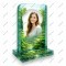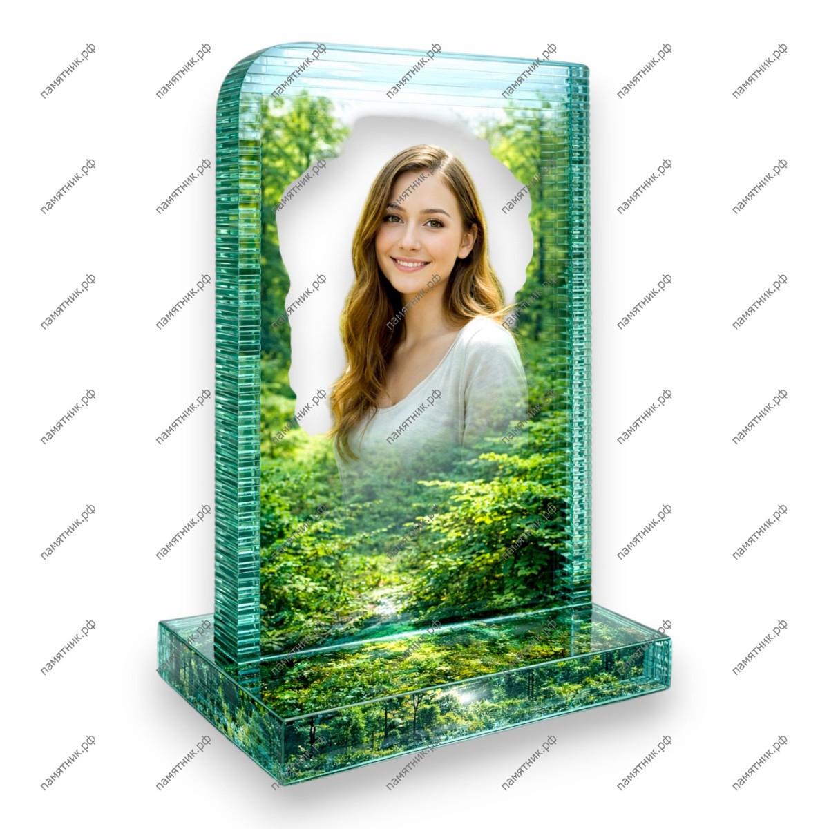 Памятник со стеклом ПС-19 отличается строгой прямоугольной формой с изысканной обработкой торцов. Многослойное стекло по периметру имеет ступенчатую фаску, создающую игру света на гранях. Фон в виде густой зелени леса придает портрету глубину, а стеклянное основание с аналогичным рисунком делает всю конструкцию визуально невесомой.