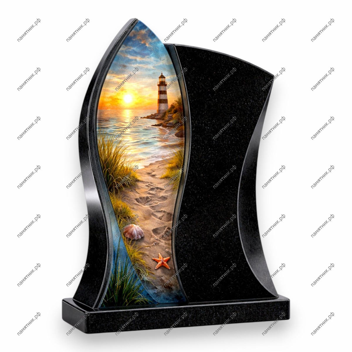Художественная композиция, посвященная теме моря и надежды. Черный гранитный монумент разделен изящным изгибом, открывающим вид на стеклянное полотно с живописным пейзажем: маяк на берегу в лучах заката.