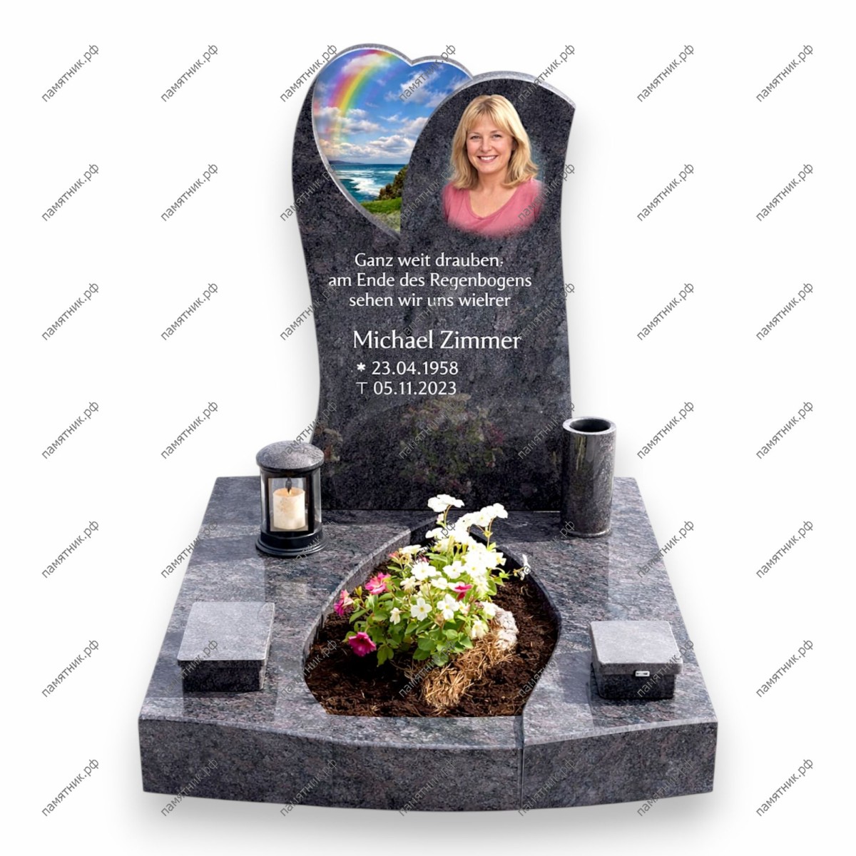 Эмоциональная модель из серо-голубого гранита с волнообразным срезом. В верхний угол стелы вписано стеклянное сердце с изображением радуги над океаном, символизирующее надежду и встречу за горизонтом.