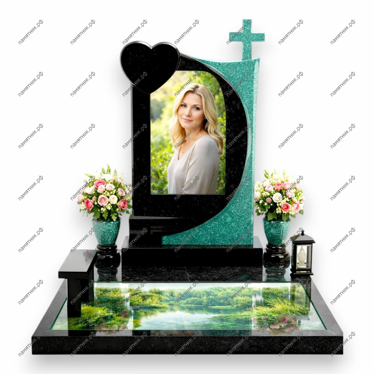 Эксклюзивный мемориальный комплекс с горизонтальным остеклением. Стела из черного гранита с навершием в виде сердца дополнена изумрудной искрящейся колонной, а на надгробной плите расположена масштабная панорама лесного озера.