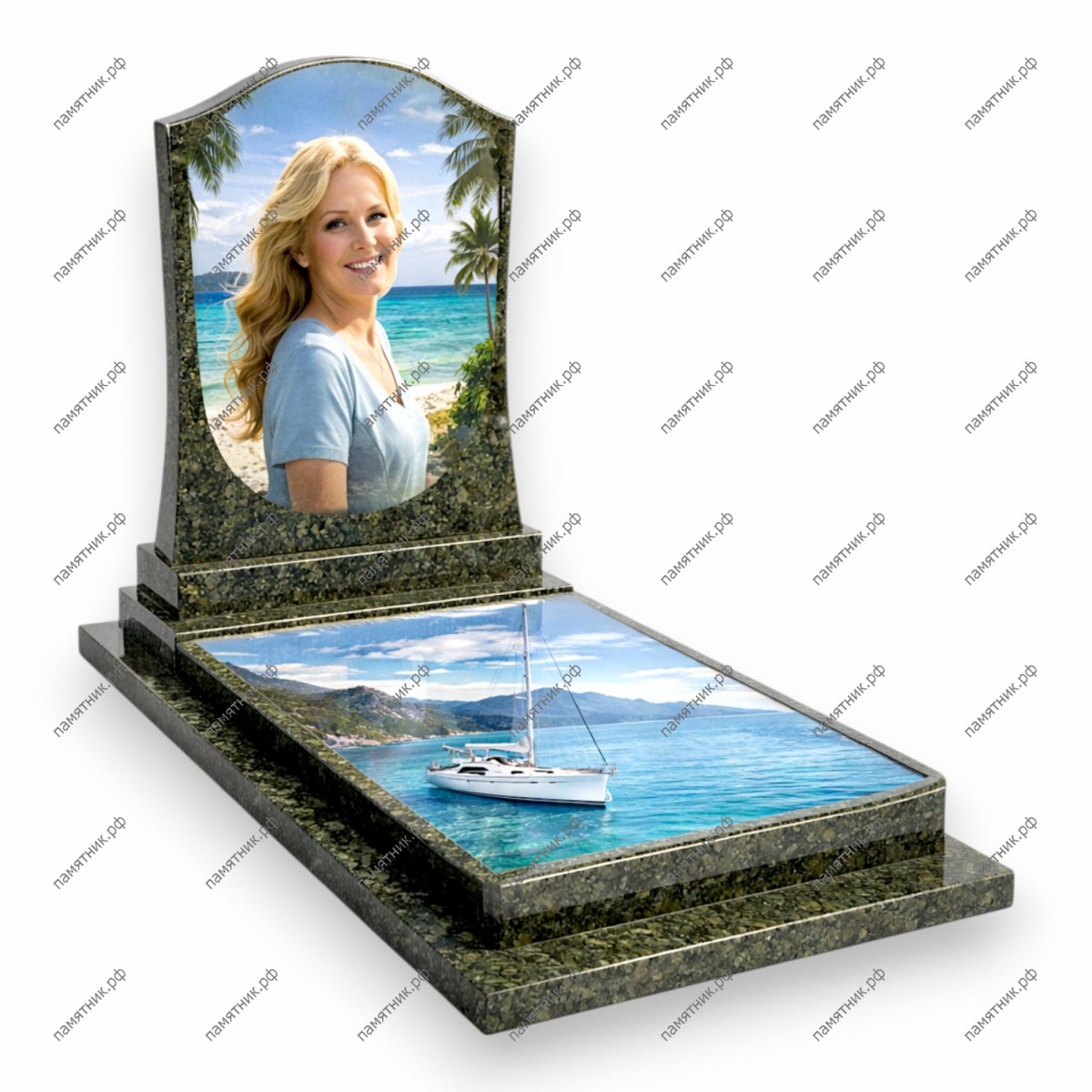 Модель в классическом стиле из благородного зеленовато-серого гранита. Памятник ориентирован на морскую тематику: арочная стела с портретом дополняется горизонтальным панно с изображением белоснежной яхты в бирюзовой бухте.