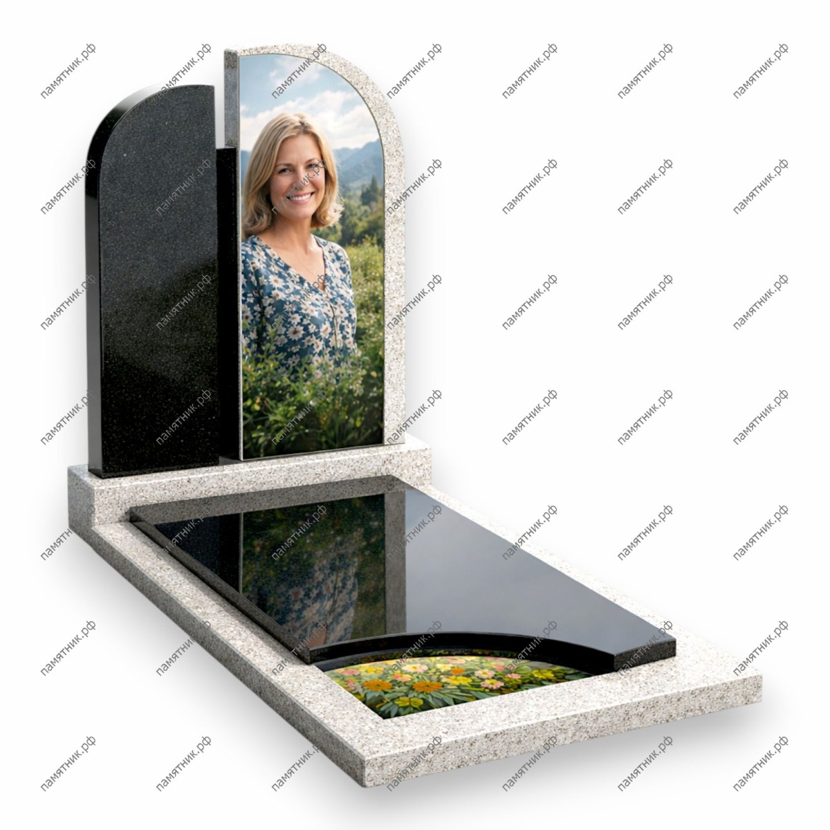 Комбинированный мемориал, сочетающий строгую геометрию и природные мотивы. Составная стела из черного и светлого камня дополнена горизонтальной вставкой с изображением яркого цветущего сада.