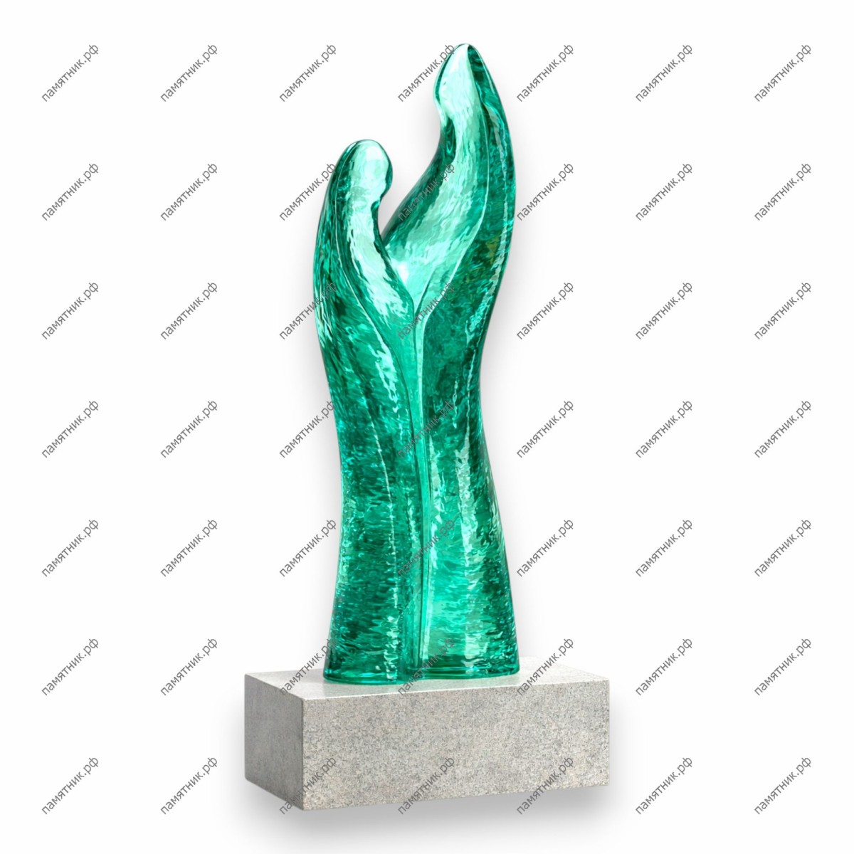Памятник со стеклом ПС-22 представляет собой скульптурную композицию из изумрудного стекла, символизирующую единство душ. Абстрактные формы напоминают две сплетающиеся фигуры, стремящиеся ввысь. Контрастный постамент из светлого гранита подчеркивает насыщенный цвет и сложную фактуру стеклянного элемента.