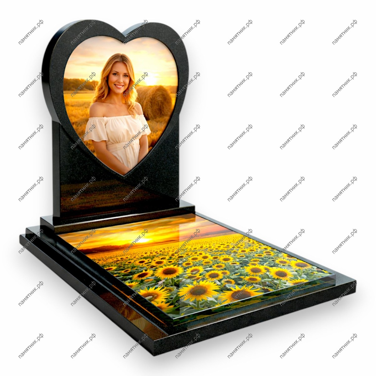 Мемориал в форме сердца, выполненный из глубокого черного гранита. Яркий акцент в виде подсолнухов на закате, запечатленный на обеих стеклянных вставках, придает памятнику жизнеутверждающий и эмоциональный характер.