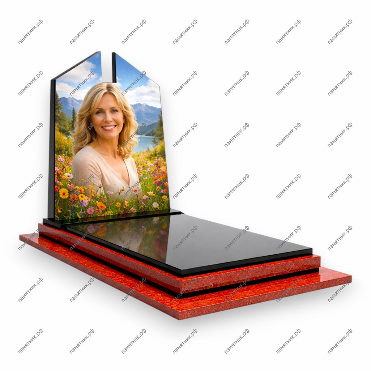 Оригинальная геометрическая модель в форме стилизованного дома или стрелы, устремленной вверх. Контраст черного камня и ярко-красного гранитного подиума выгодно подчеркивает красочный портрет на фоне летнего луга.