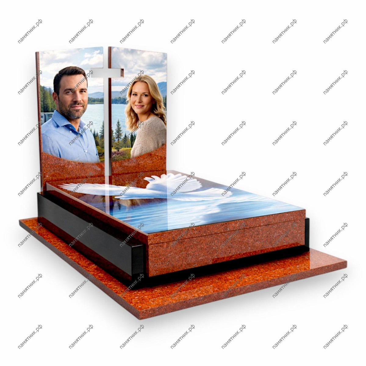 Гармоничная семейная модель, выполненная в контрастном сочетании красного и черного гранита. Вертикальные стелы разделены изящным прорезным крестом, а на горизонтальной надгробной плите расположено масштабное стеклянное полотно с изображением белого голубя над водой, символизирующего мир и чистоту души.